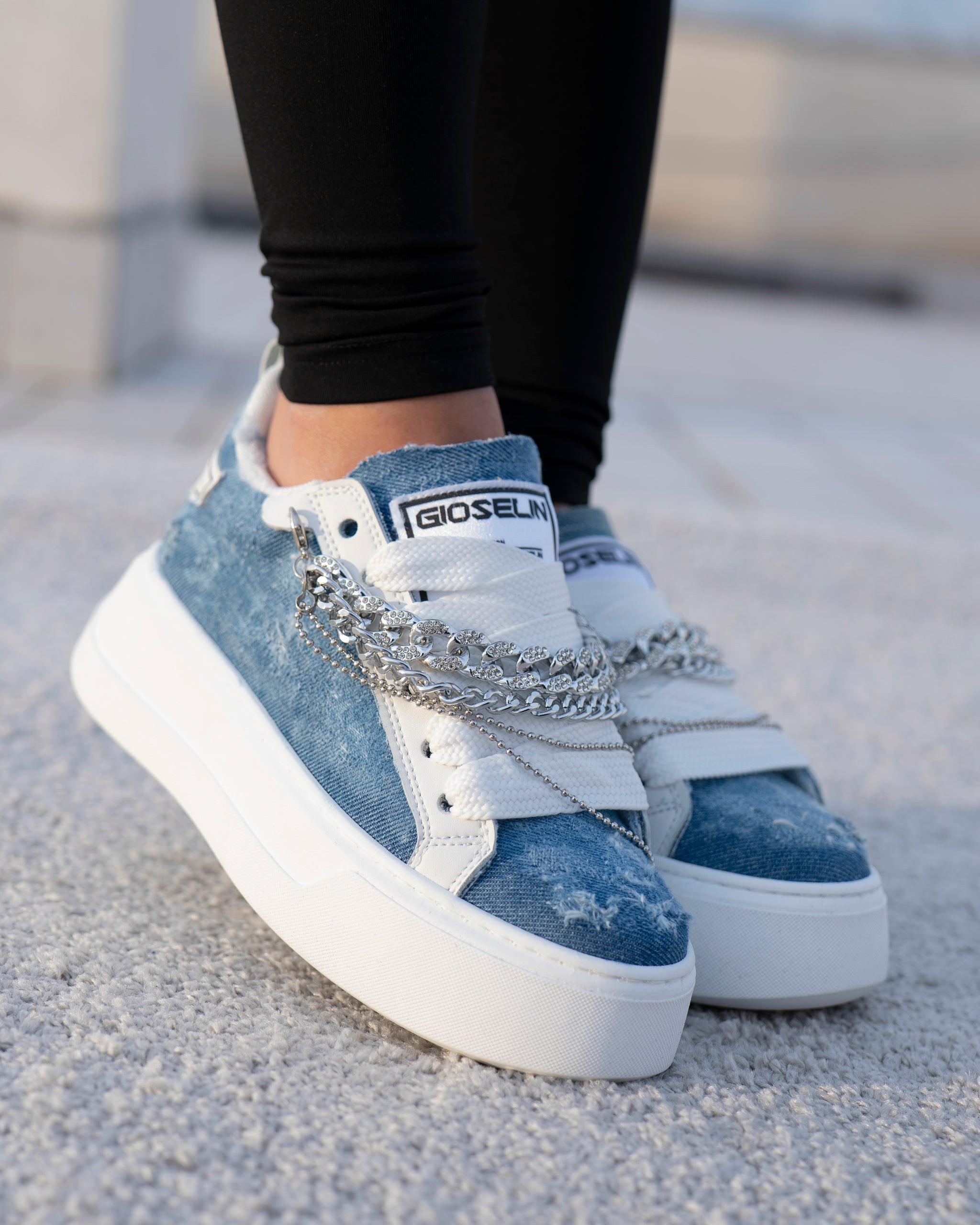 Un mix perfetto tra eleganza e streetwear. Collier Denim Argento è la sneaker che ridefinisce il concetto di versatilità e stile. Realizzata in vero jeans, questa scarpa si distingue per il suo design moderno e il dettaglio esclusivo: un collier di catene argento removibile, che aggiunge un tocco di luce e carattere al tuo look.