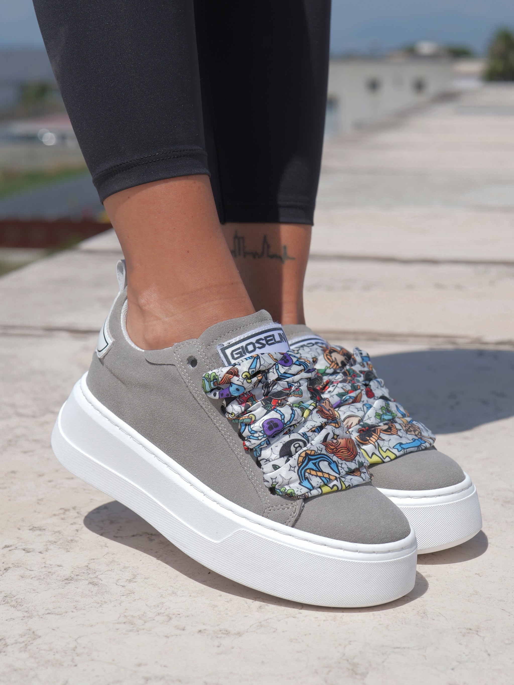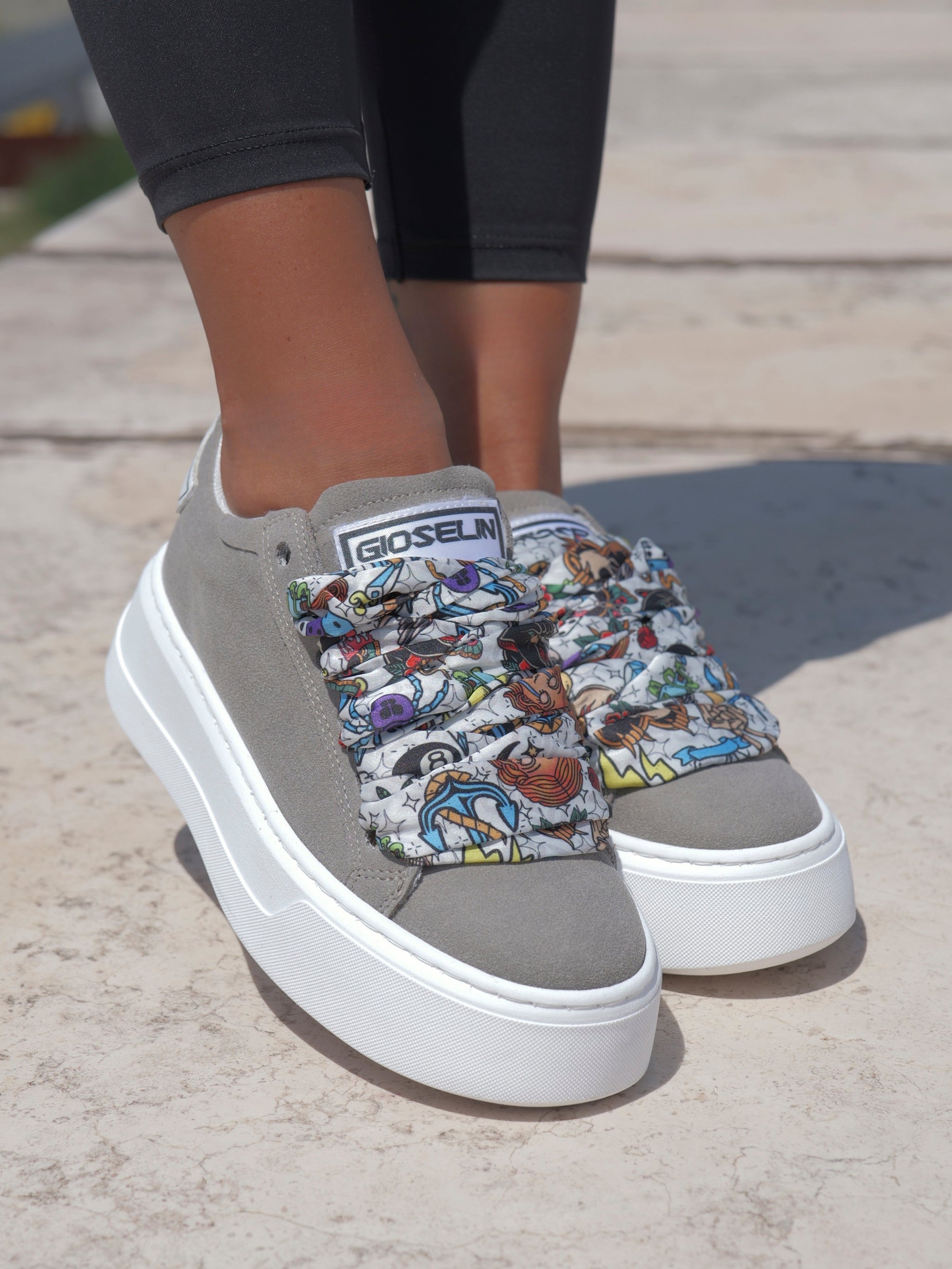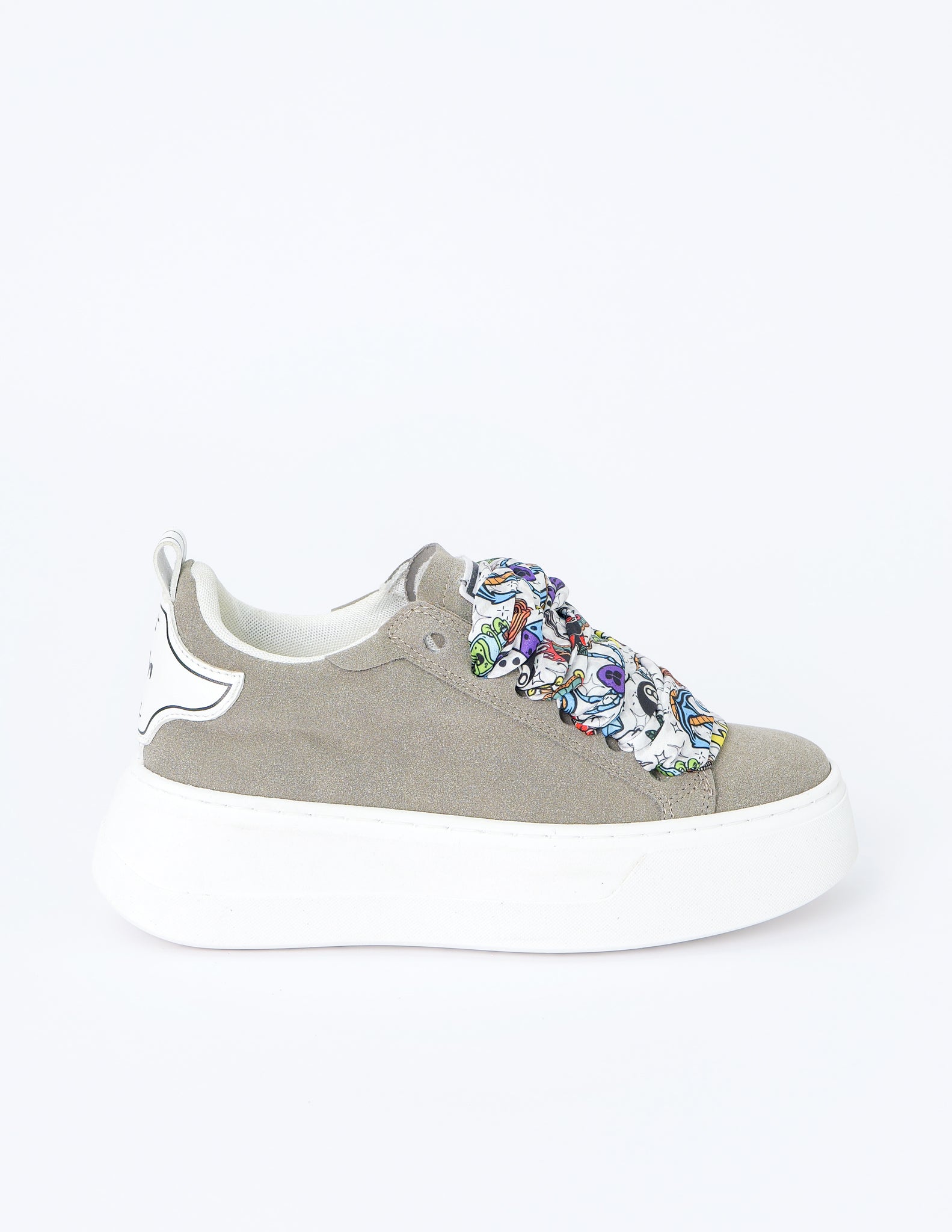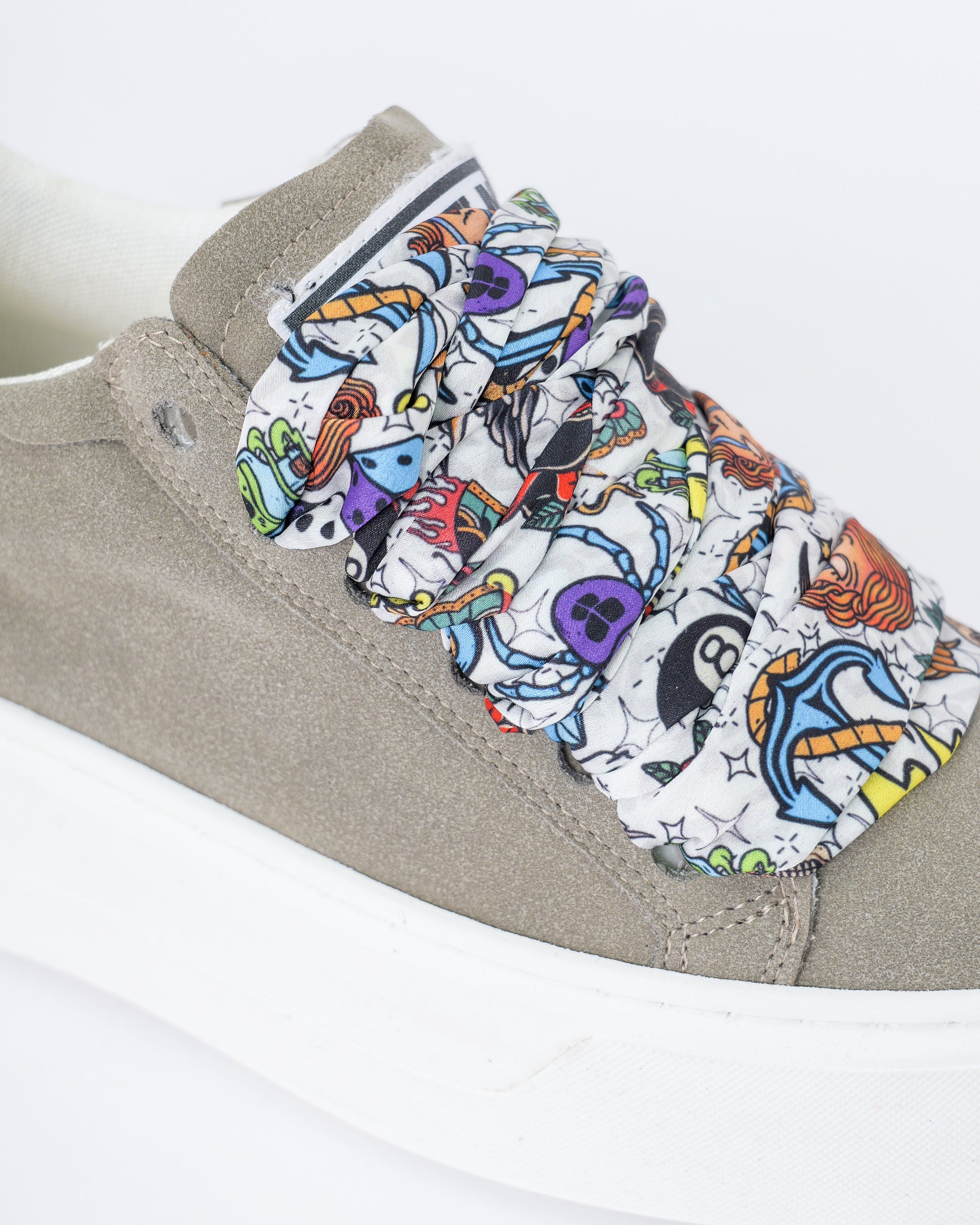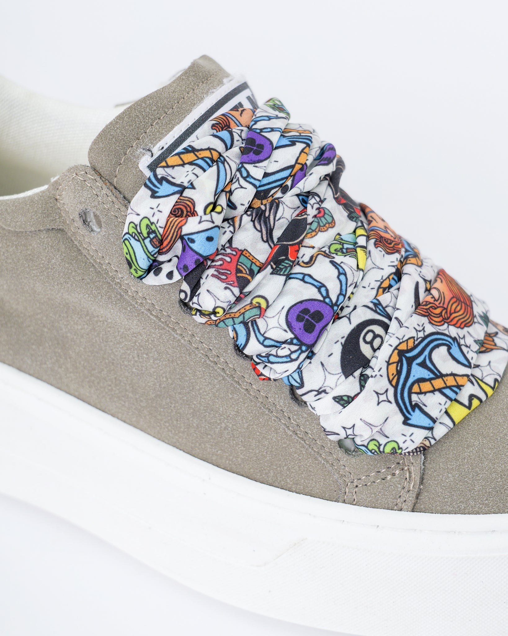 Realizzata in crosta soft beige dalle tonalità neutre e versatili, CHUNKY Tattoo si distingue per i suoi lacci speciali con fantasia tattoo, un’esplosione di dettagli ispirati al mondo dell’arte urbana, dei graffiti e dell’illustrazione contemporanea. Ogni laccio diventa un manifesto visivo, capace di trasformare la scarpa in un vero e proprio accessorio statement.
