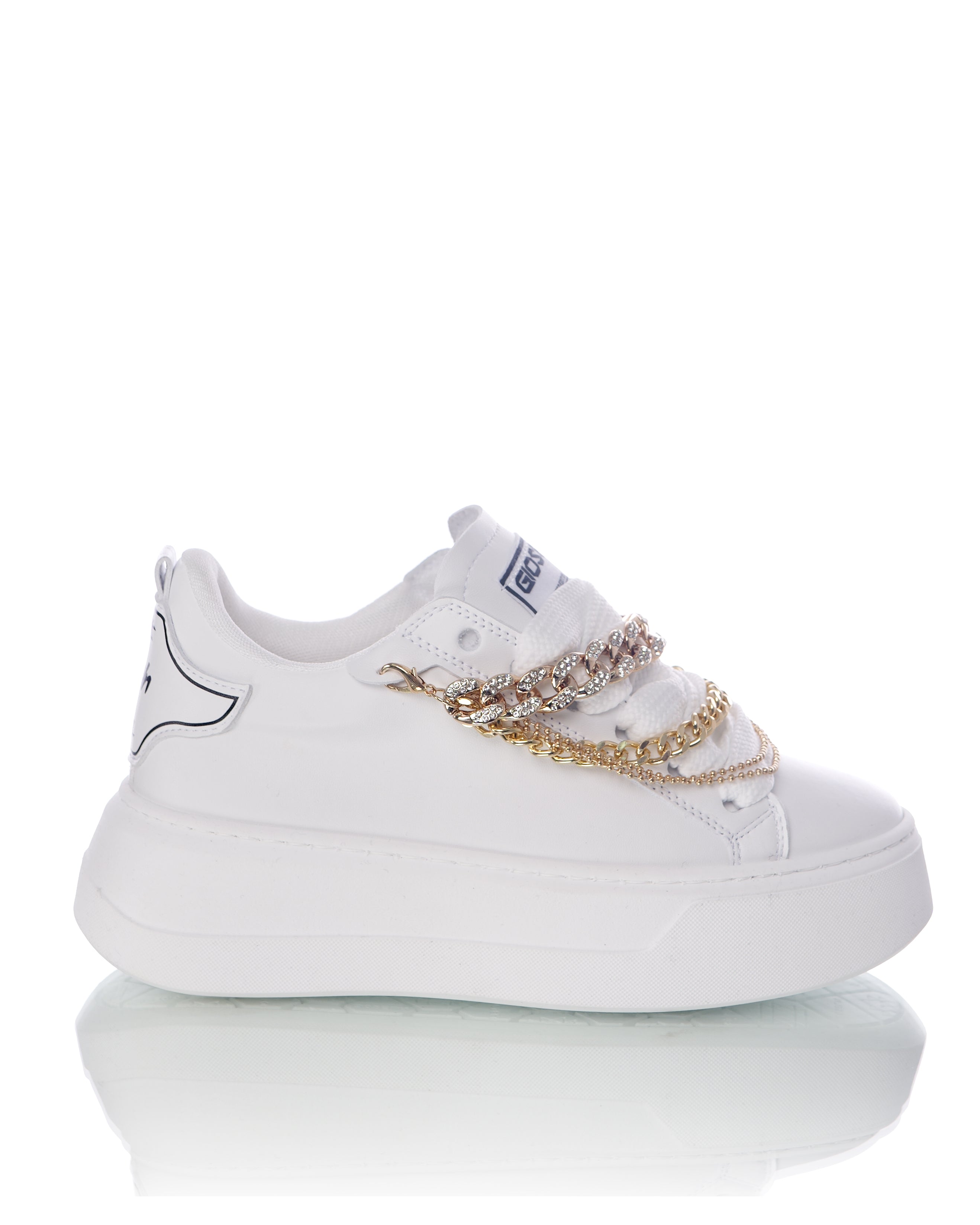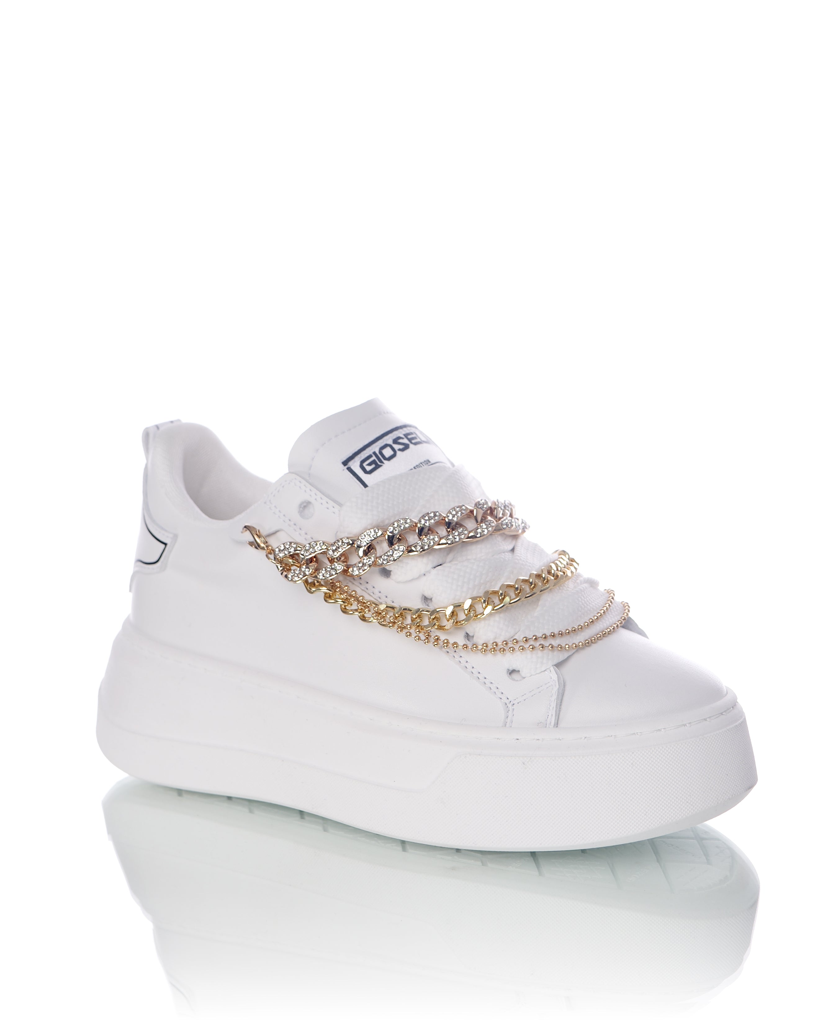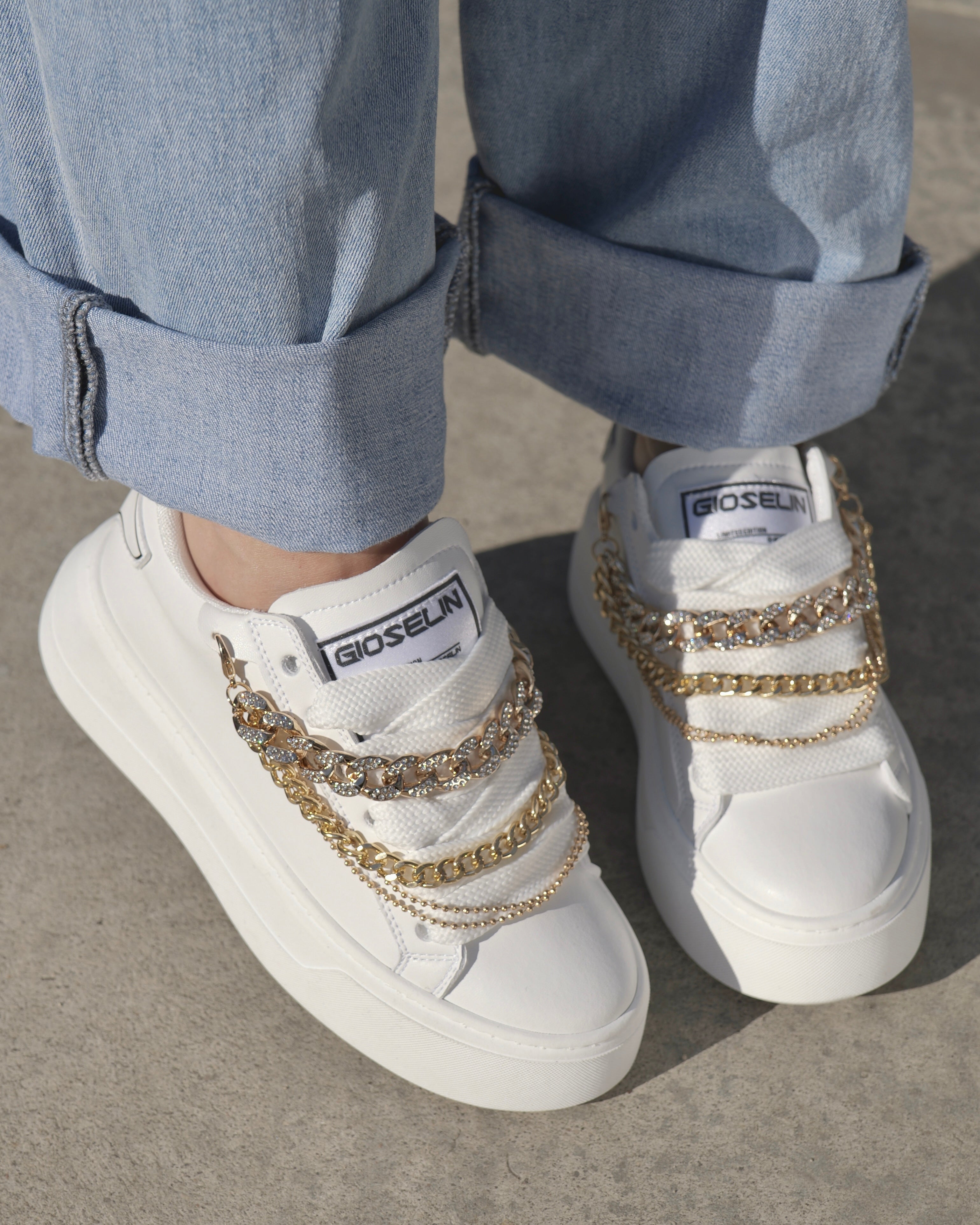 Il modello Collier di Gioselin è una vera dichiarazione di stile, dove l’eleganza incontra la modernità in una sneaker dal design esclusivo e distintivo. La base bianca e pulita di questa scarpa lascia spazio all’elemento più sorprendente: una preziosa catena removibile, ispirata al fascino intramontabile delle collane a collier. Realizzata con cura, la catena presenta una combinazione di maglie dorate e cristalli scintillanti che si adagiano sulla tomaia in un intreccio raffinato di luce e movimento, trasformando la scarpa in un gioiello da indossare.