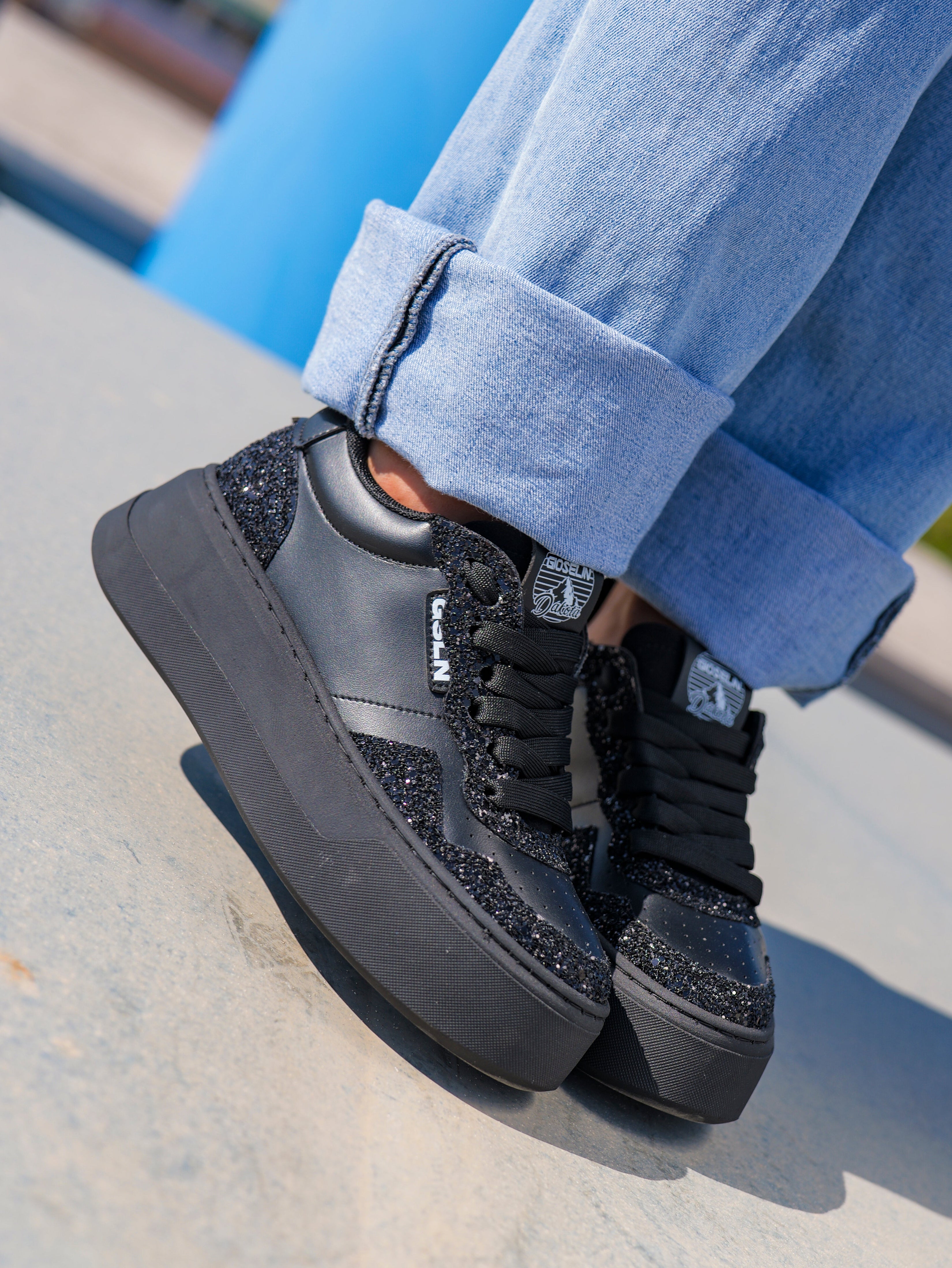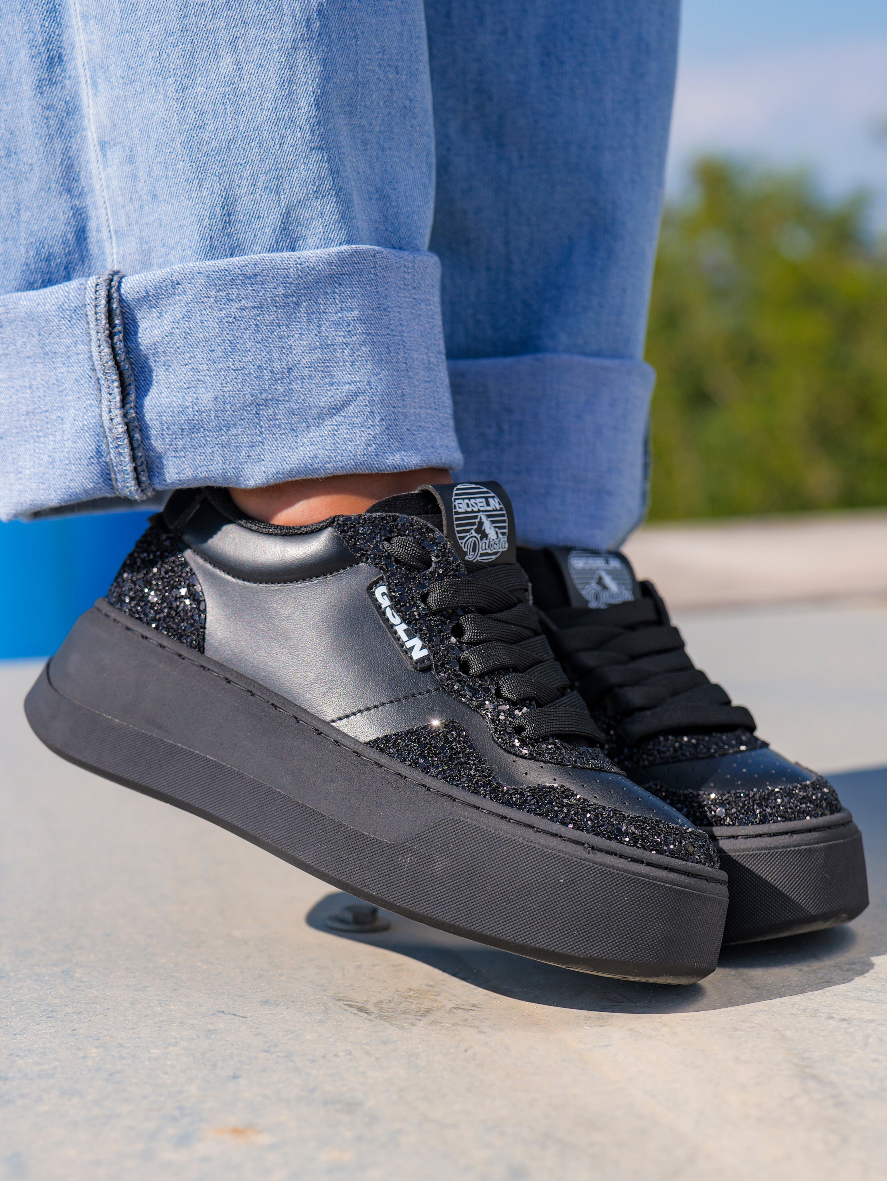 Decisa, avvolgente, inaspettatamente luminosa: Dakota Black Glitter è la nuova interpretazione in chiave total black dell’iconica sneaker Gioselin. Una scarpa che ridefinisce il concetto di urban glam, combinando la profondità assoluta del nero con una cascata di glitter ton-sur-ton che riflette la luce con discrezione e classe.