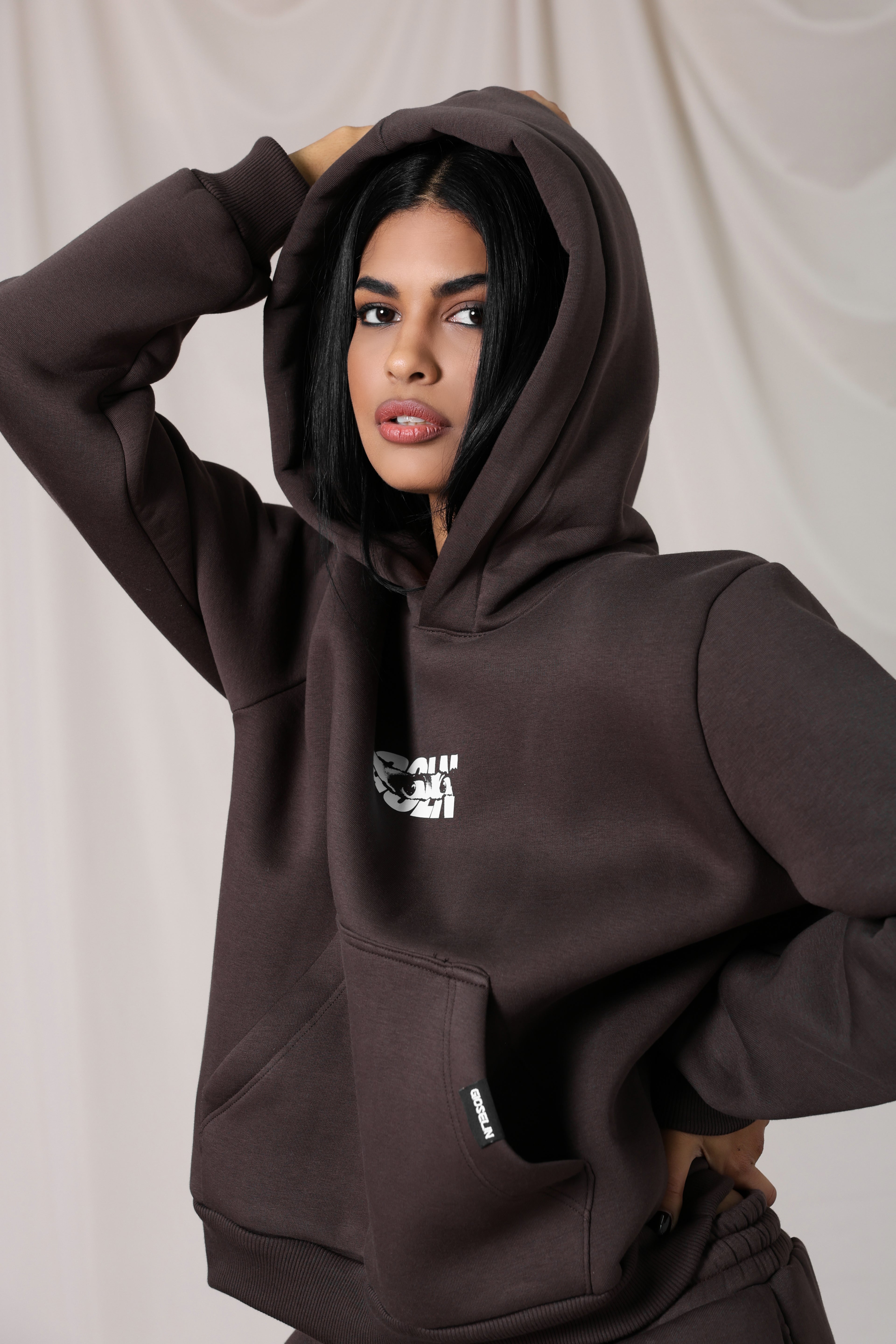 Un completo che esprime l’anima streetwear di Gioselin, mantenendo un tocco raffinato grazie alla nuance marrone. La modella indossa la taglia S.