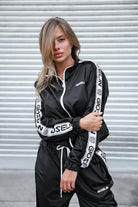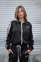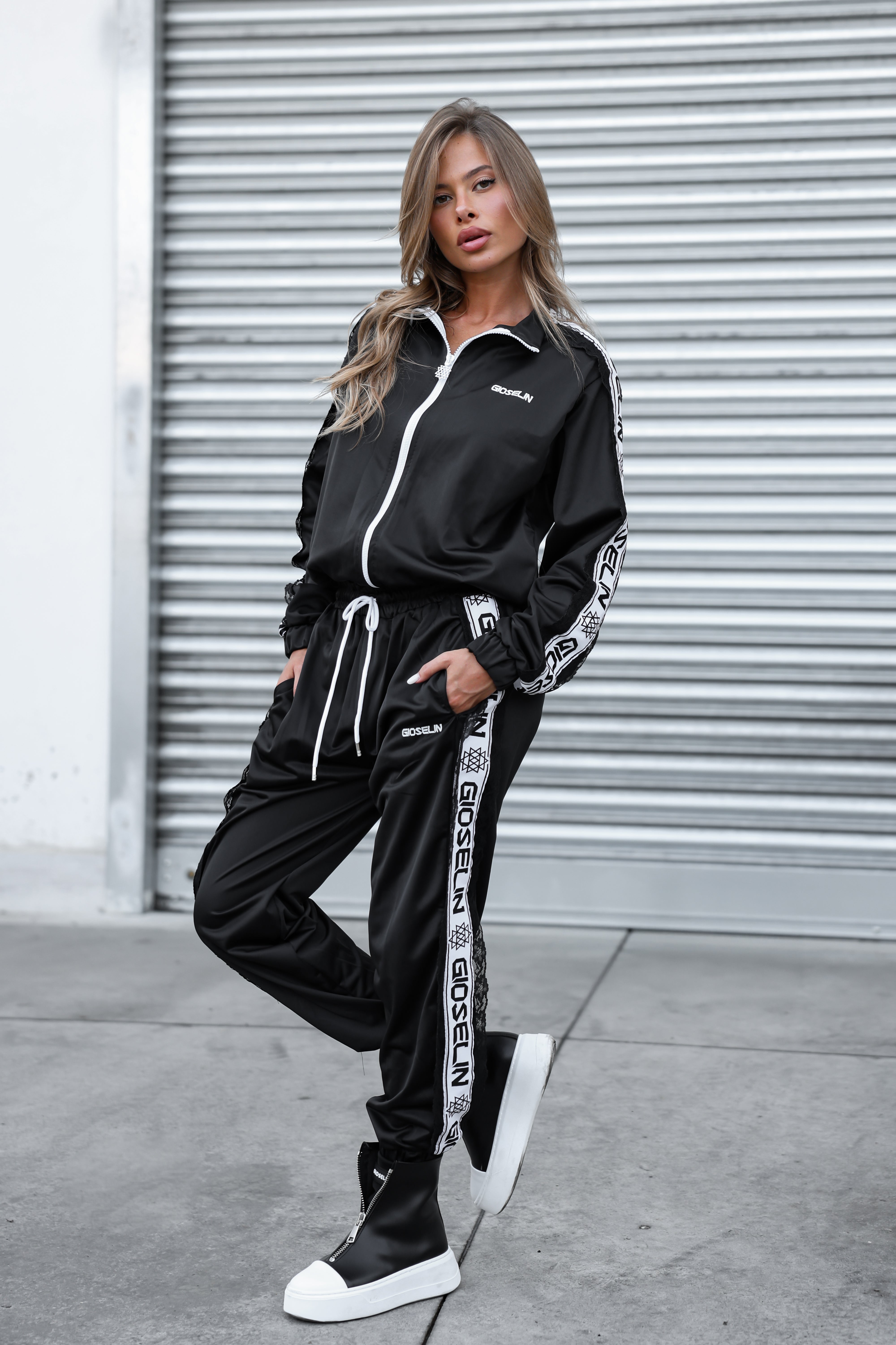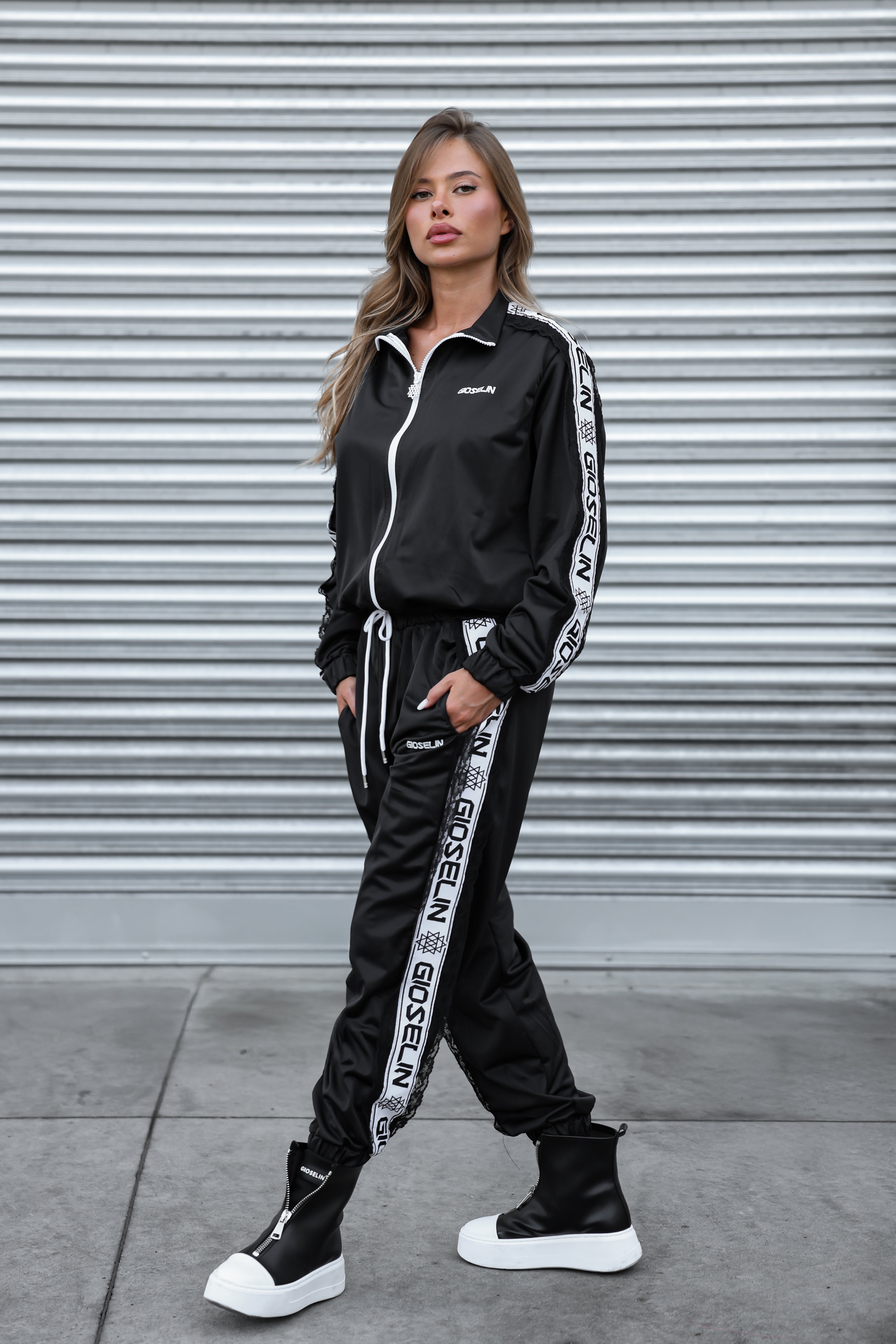 Realizzata in acetato tecnico lucido, morbido e avvolgente, questa tuta – venduta in coordinato – è composta da giacca con zip e pantalone con vita regolabile. Ma ciò che la rende unica è il dettaglio che incanta: un raffinato ricamo in pizzo merlettato, applicato lungo le maniche e le bande laterali del pantalone. Un richiamo elegante e sofisticato che contrasta con la potenza del logo Gioselin in stampa maxi.
