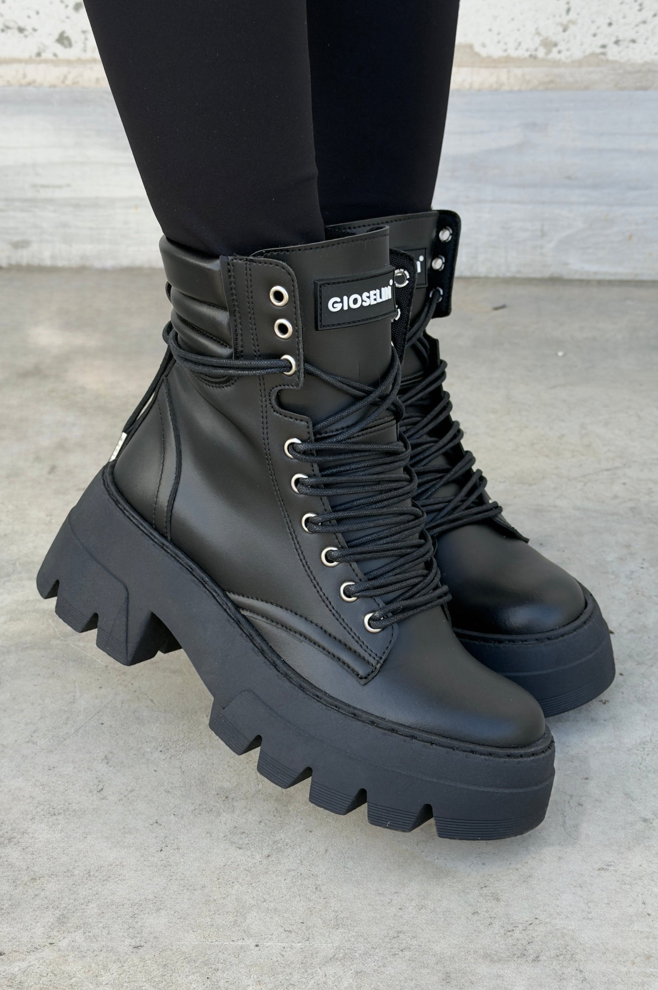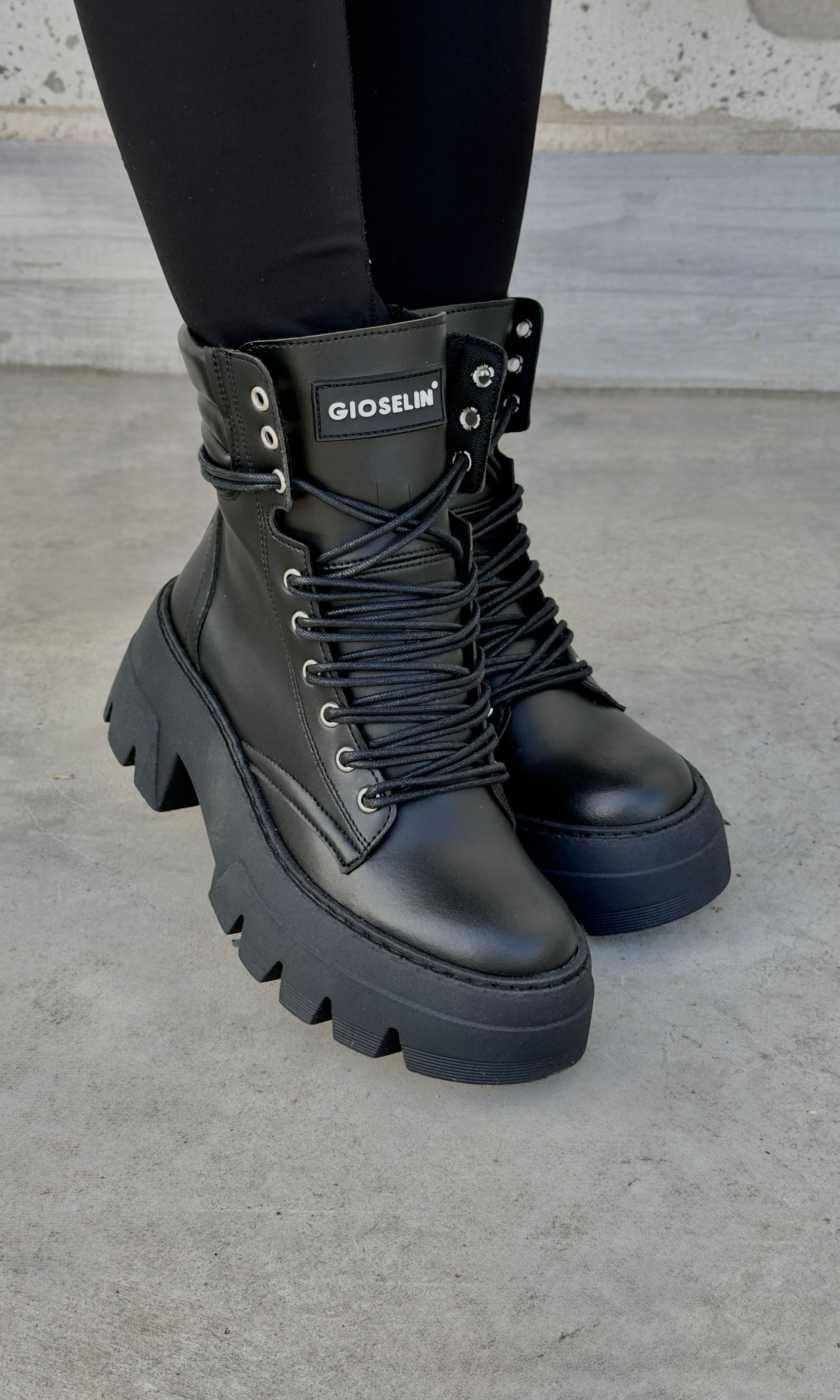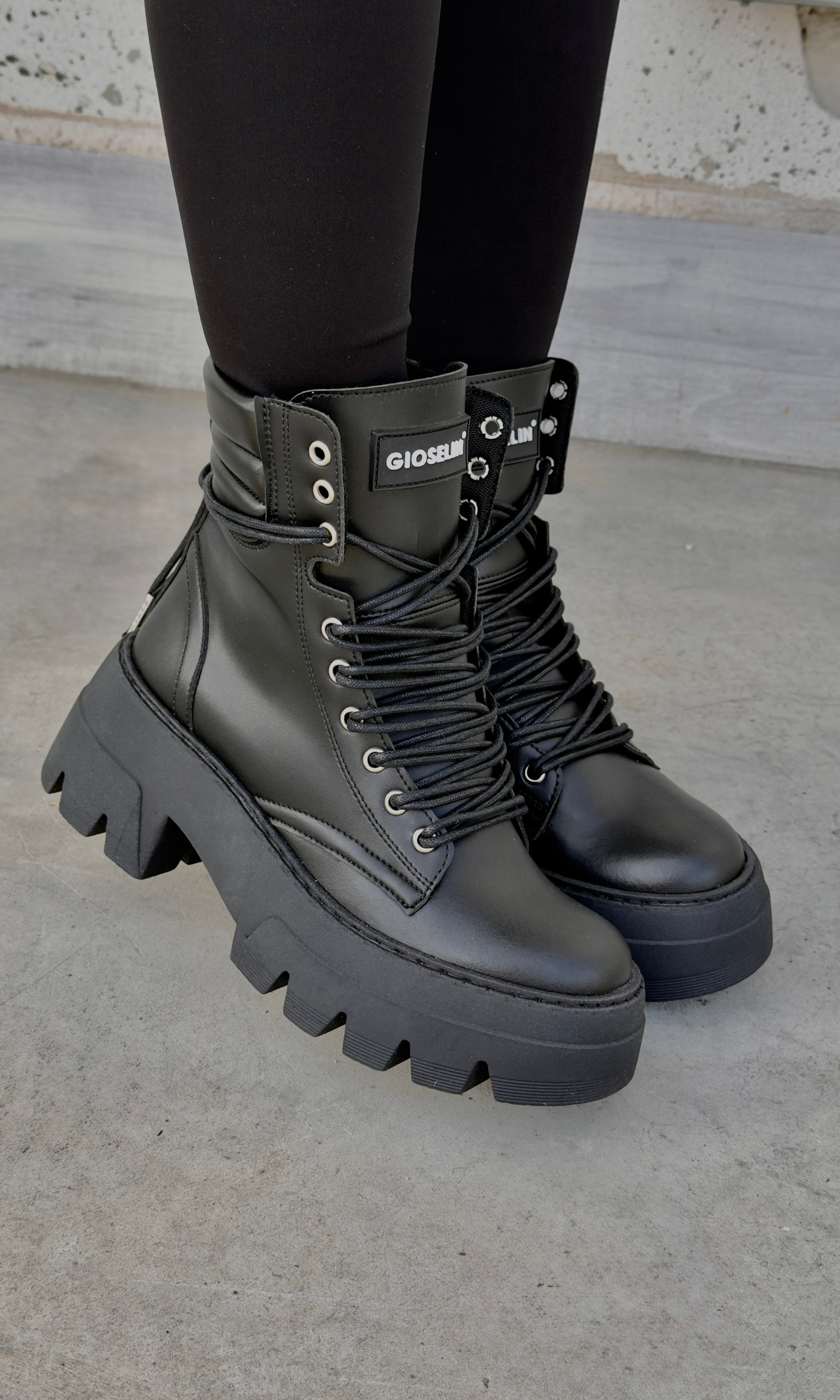 Audace, grintoso e dallo stile inconfondibile: lo stivale TOWER di Gioselin è il must-have della nuova collezione. Realizzato in pelle nera, presenta una linea decisa con allacciatura frontale e dettagli metallici che esaltano il carattere urban della calzatura.