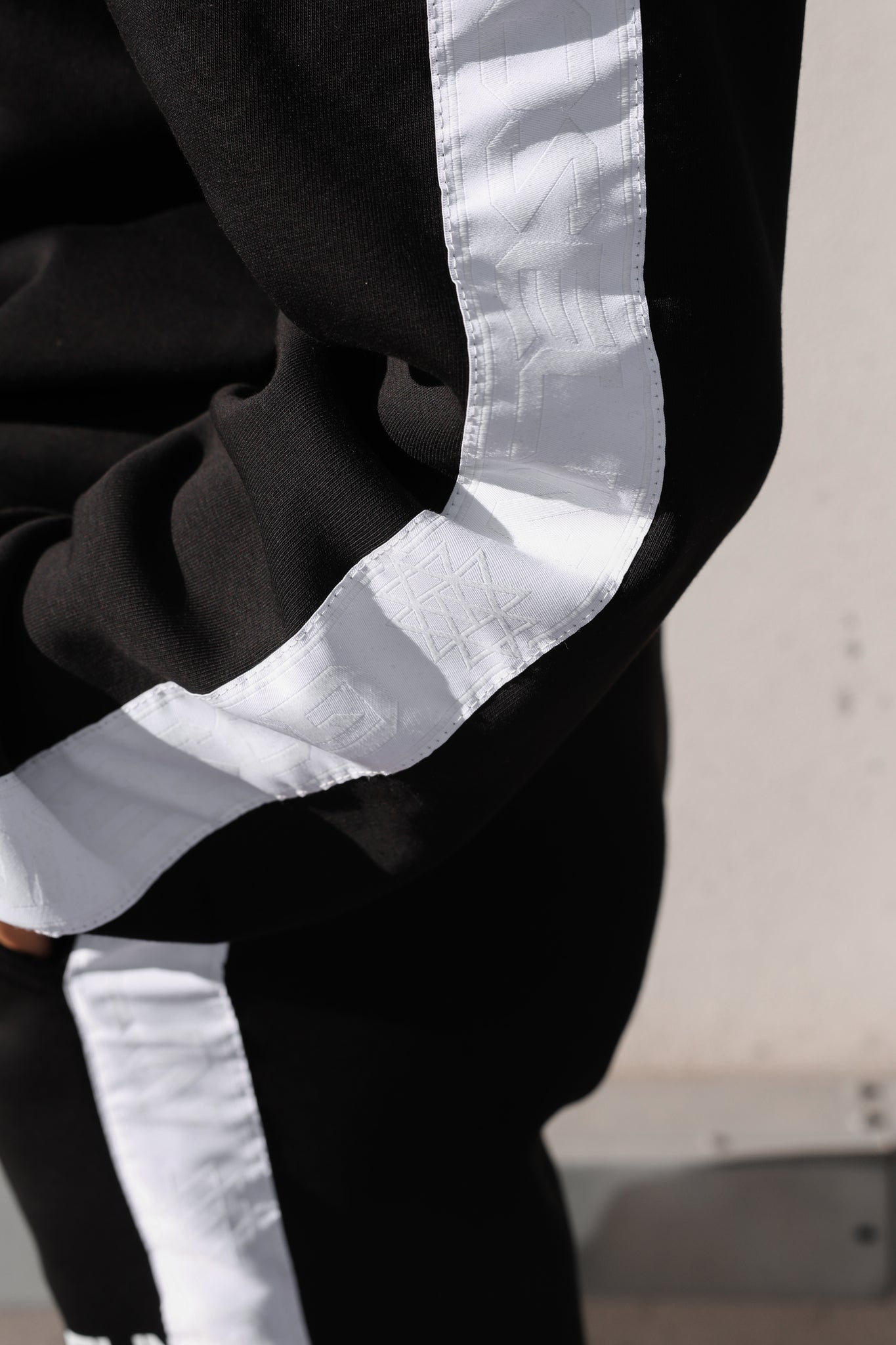 Banda tono su tono applicata lungo le maniche e sui lati del pantalone