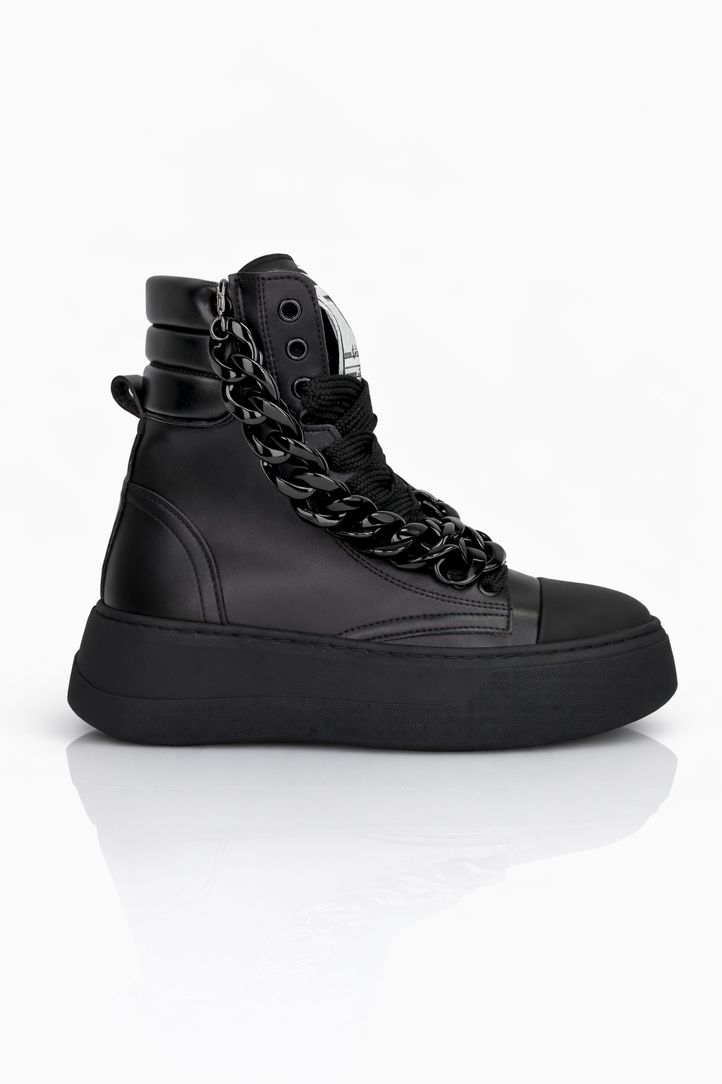 La struttura high-top avvolge la caviglia offrendo comfort e supporto, mentre la tomaia dalla linea pulita valorizza la presenza della catena, trasformando la sneaker in un vero statement fashion. L’accessorio, perfettamente integrato nel design, dona movimento e unicità, mantenendo un’estetica elegante e versatile.