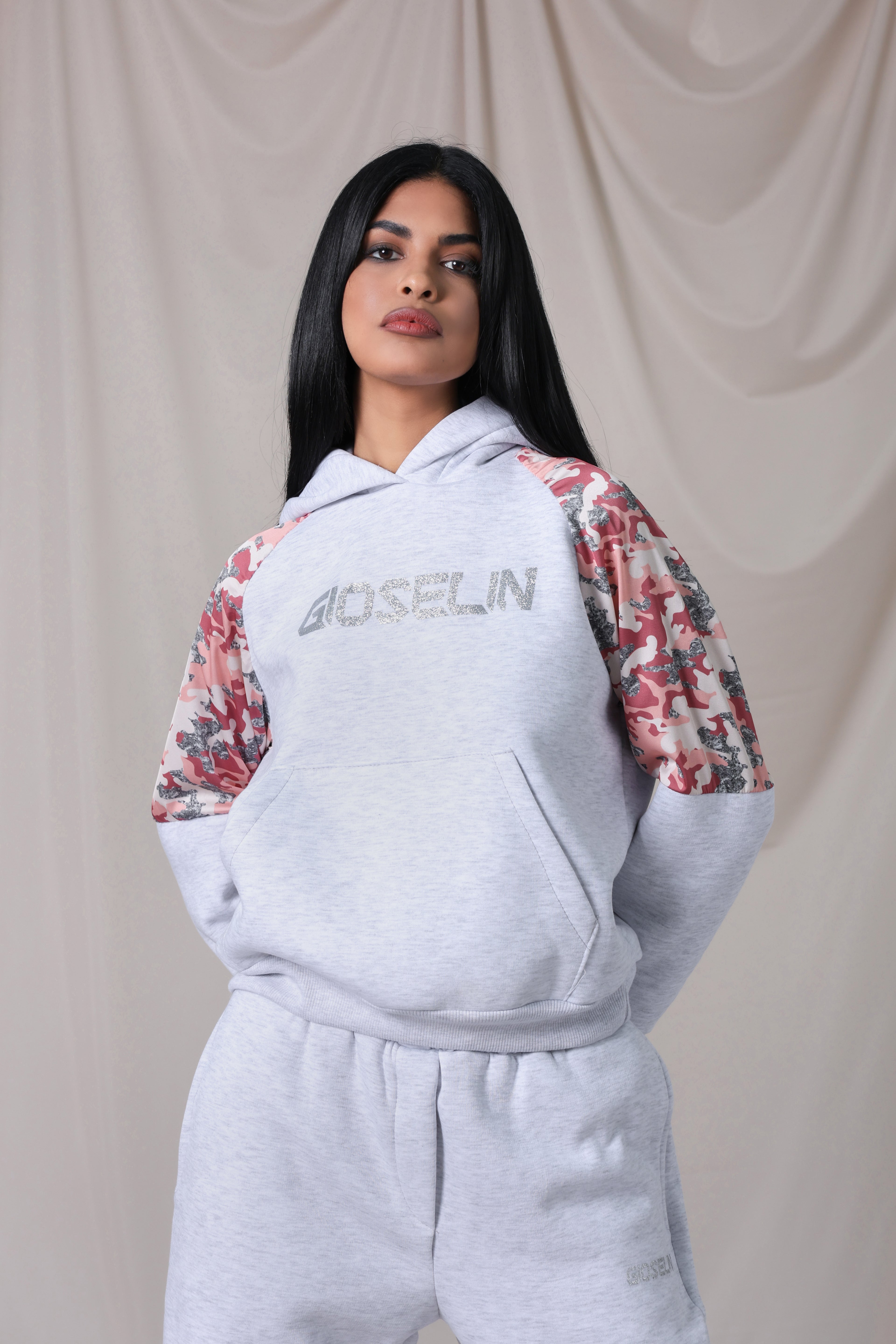 La felpa è dotata di cappuccio e fascia elastica in vita per una vestibilità confortevole, arricchita dal logo Gioselin glitterato e dalle maniche con dettagli camouflage shine, che donano un tocco glamour e contemporaneo. Il pantalone, con elastico in vita, completa il look con praticità e stile.