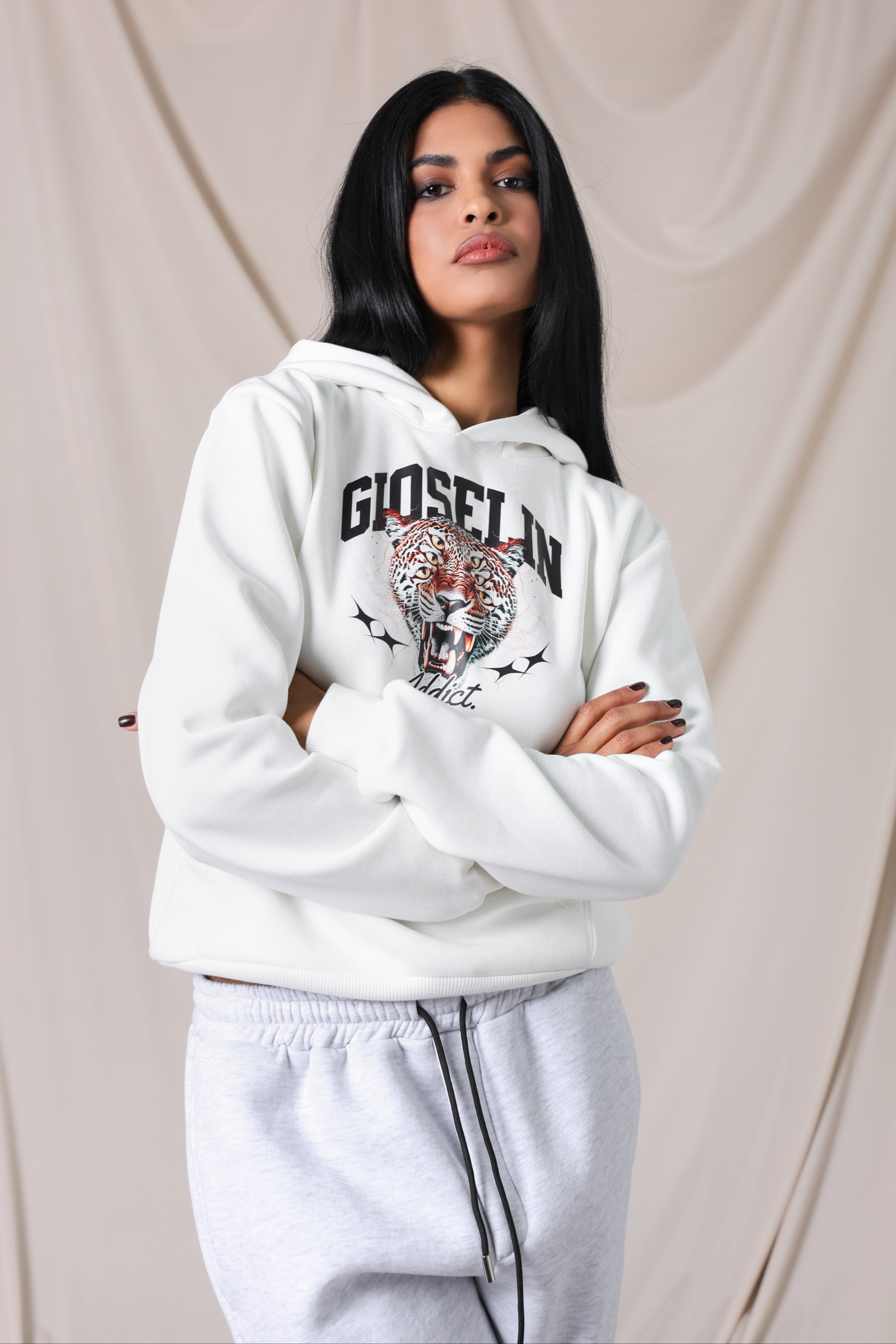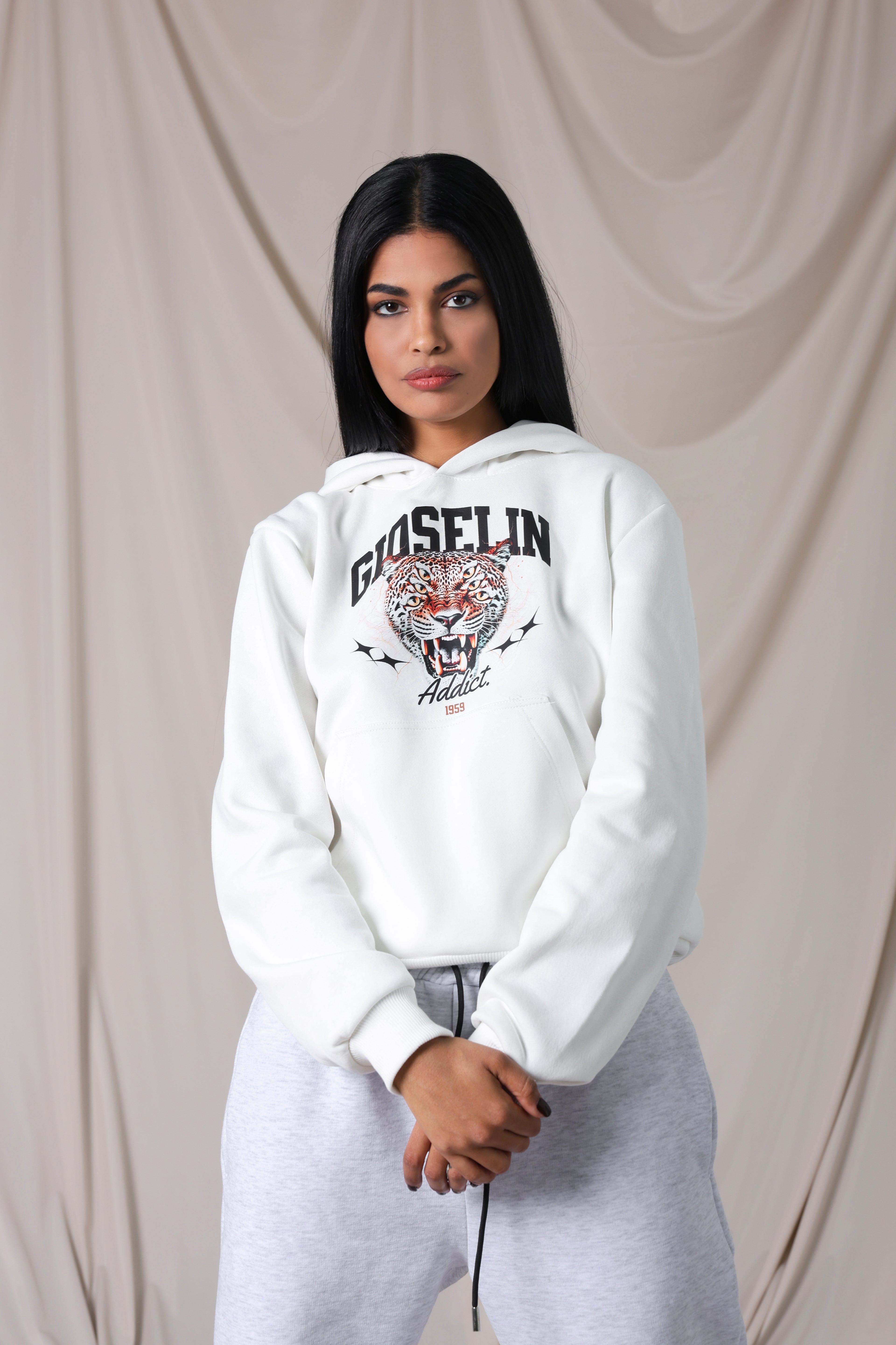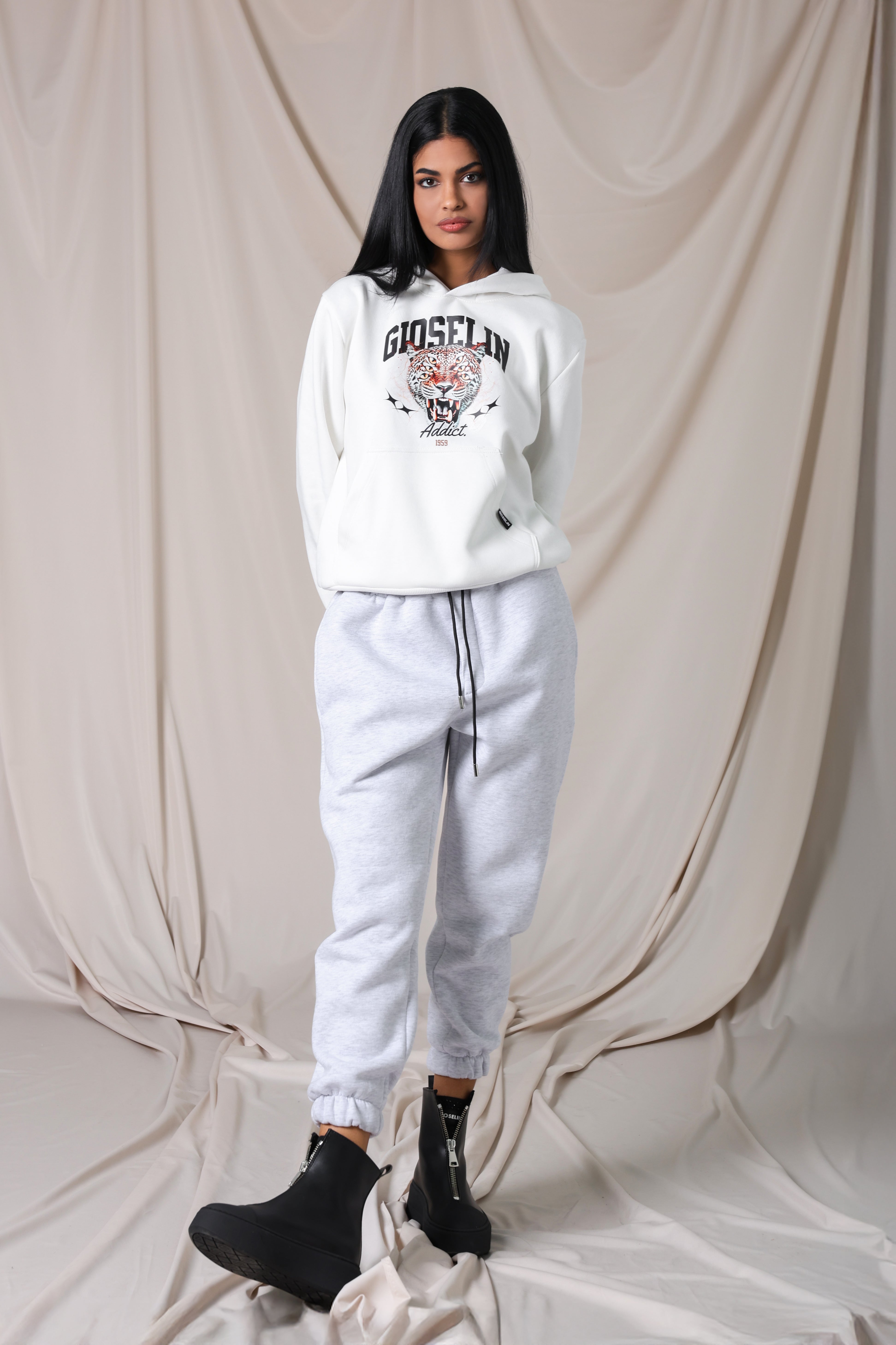 La felpa, con cappuccio e fascia elastica in vita, è impreziosita dal logo Gioselin e dalla fantasia tiger nei toni panna e grigio, che donano un effetto elegante e moderno. Il pantalone, con elastico in vita, completa l’outfit mantenendo praticità e uno stile urban-chic.
