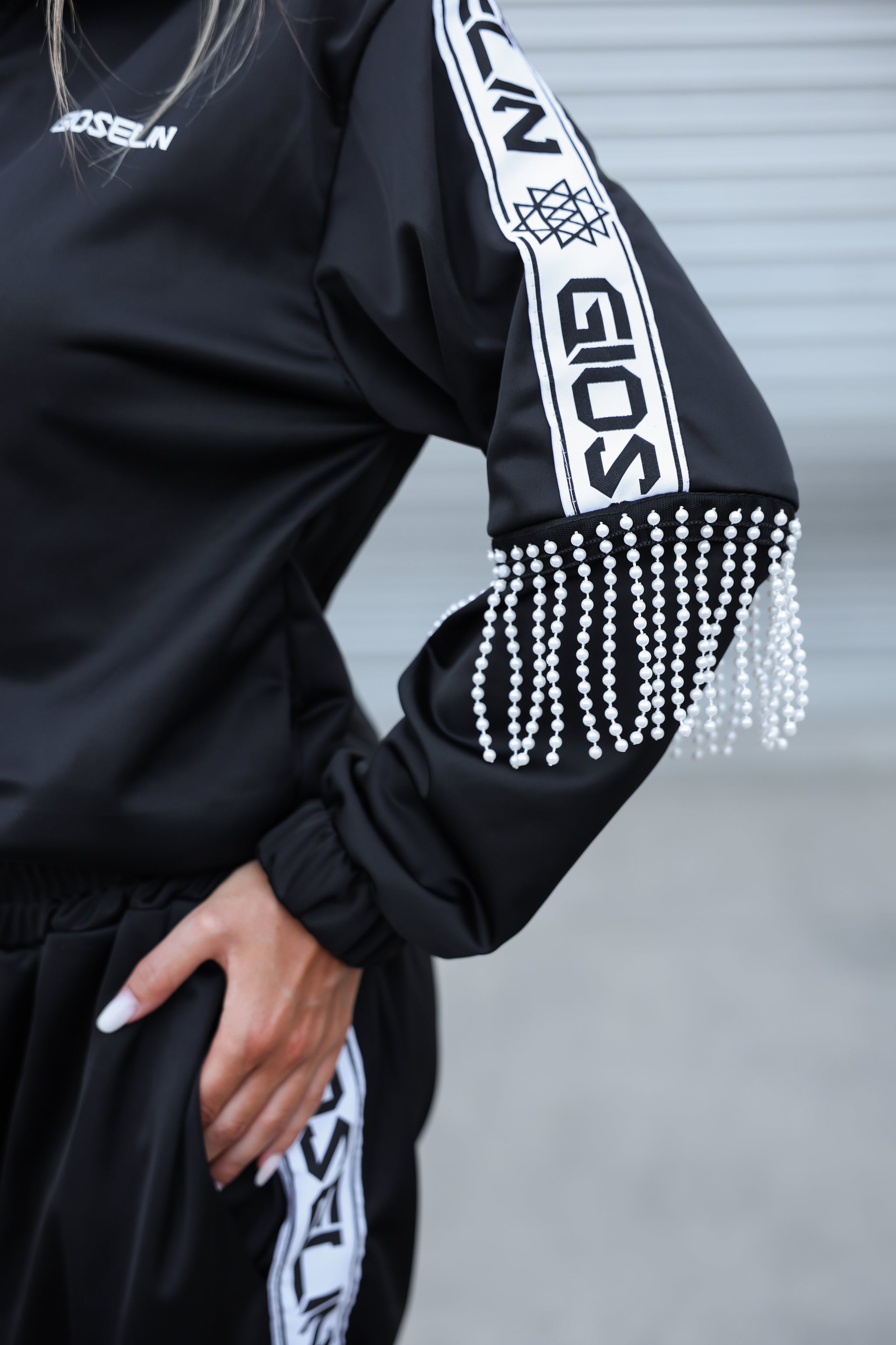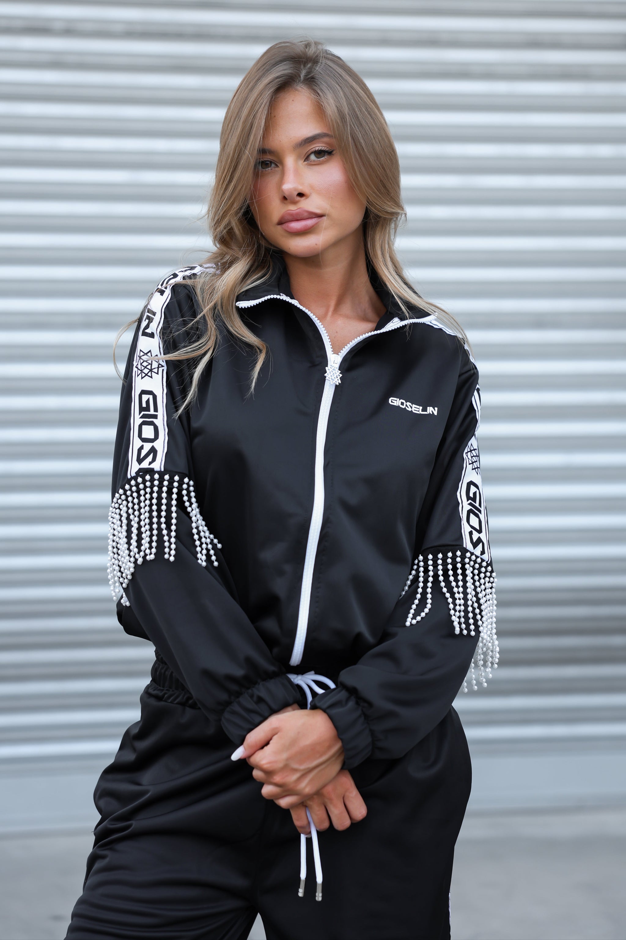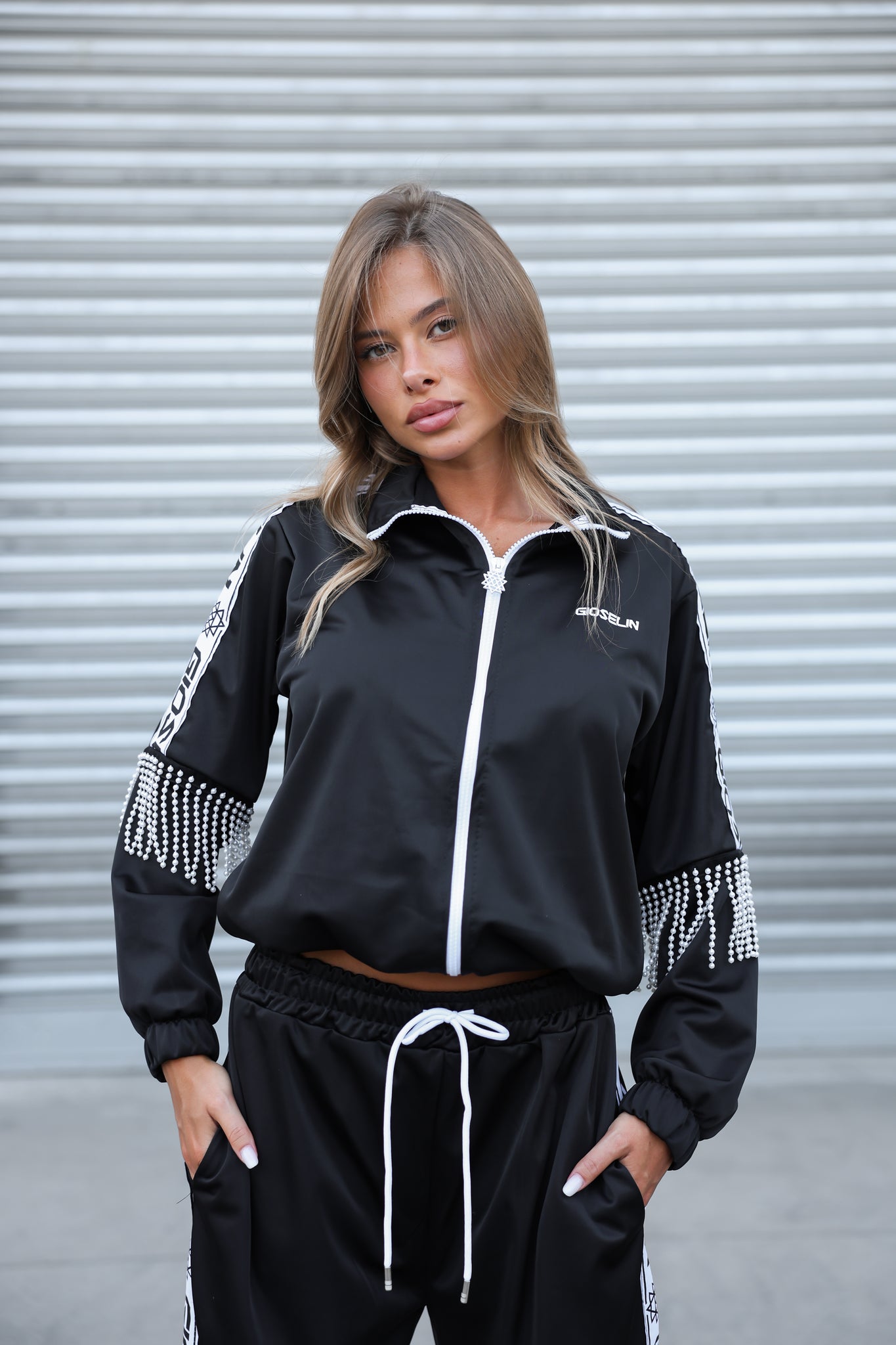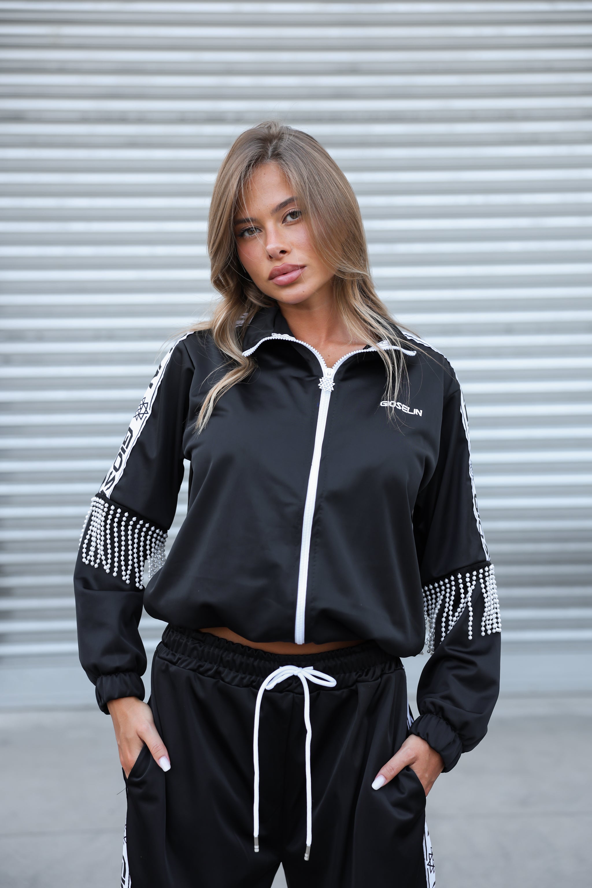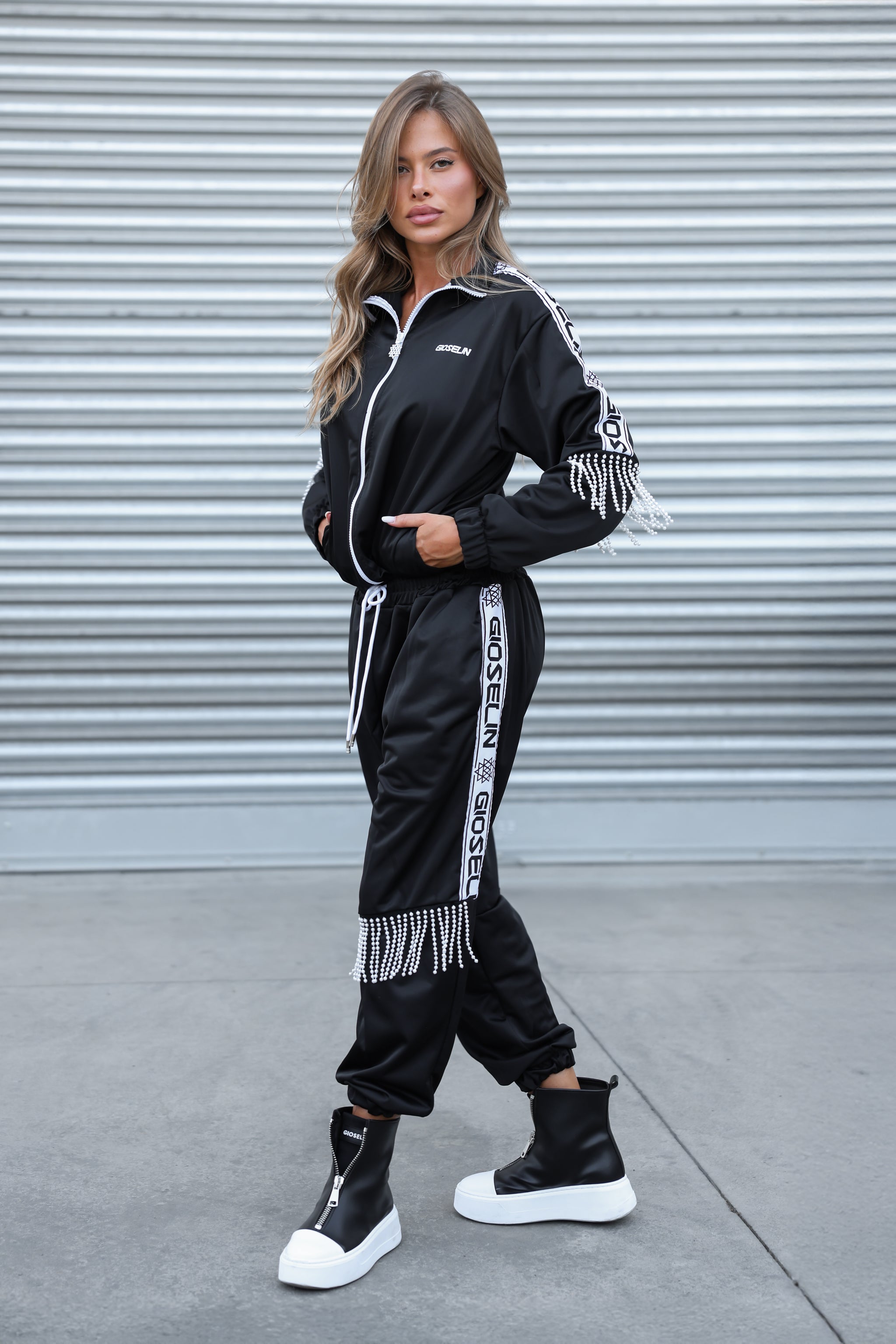 Il completo – venduto insieme – include una giacca zip con profili logati GIOSELIN su maniche e pantaloni, arricchita da un dettaglio esclusivo: frange di perle applicate a mano che ondeggiano ad ogni passo, catturando la luce e l’attenzione. Un tocco prezioso che la rende unica, proprio come chi la indossa.