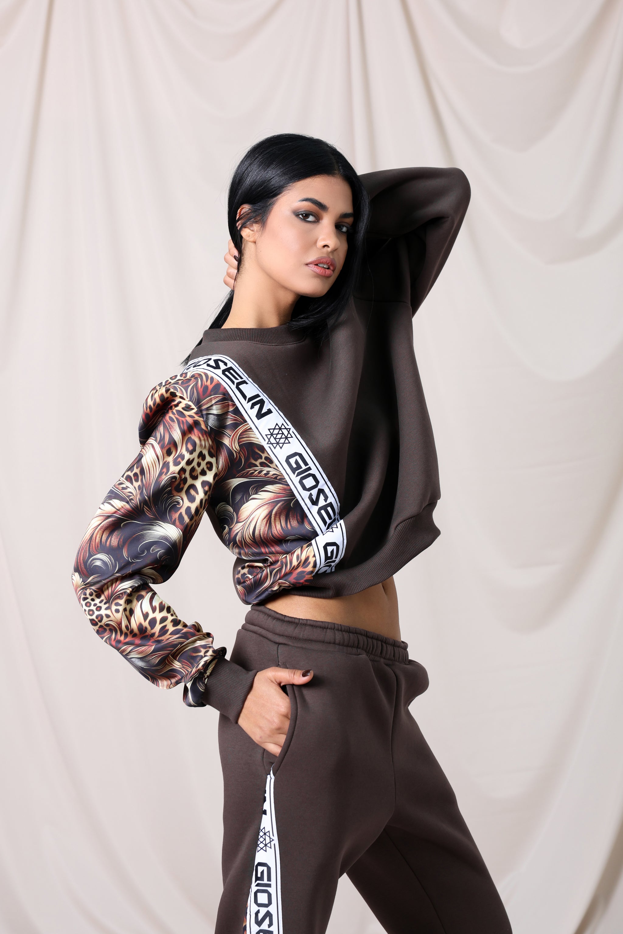 La felpa presenta un taglio moderno con elastico sul fondo e dettagli esclusivi in raso a tema barocco/wild, che donano luminosità e unicità al look. Il pantalone, con elastico in vita, è caratterizzato da un raffinato taglio a zampa che slancia la silhouette mantenendo al tempo stesso la massima comodità.