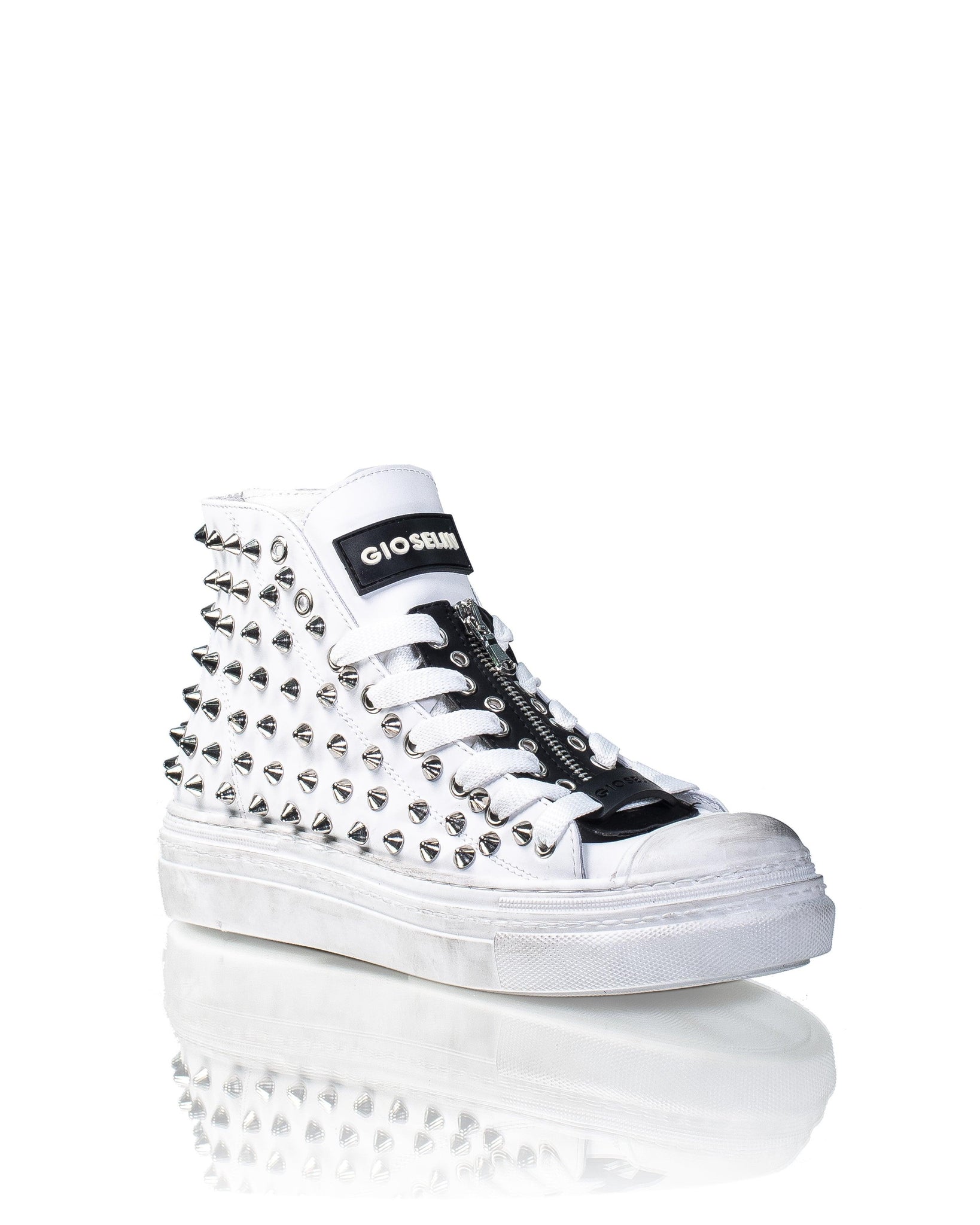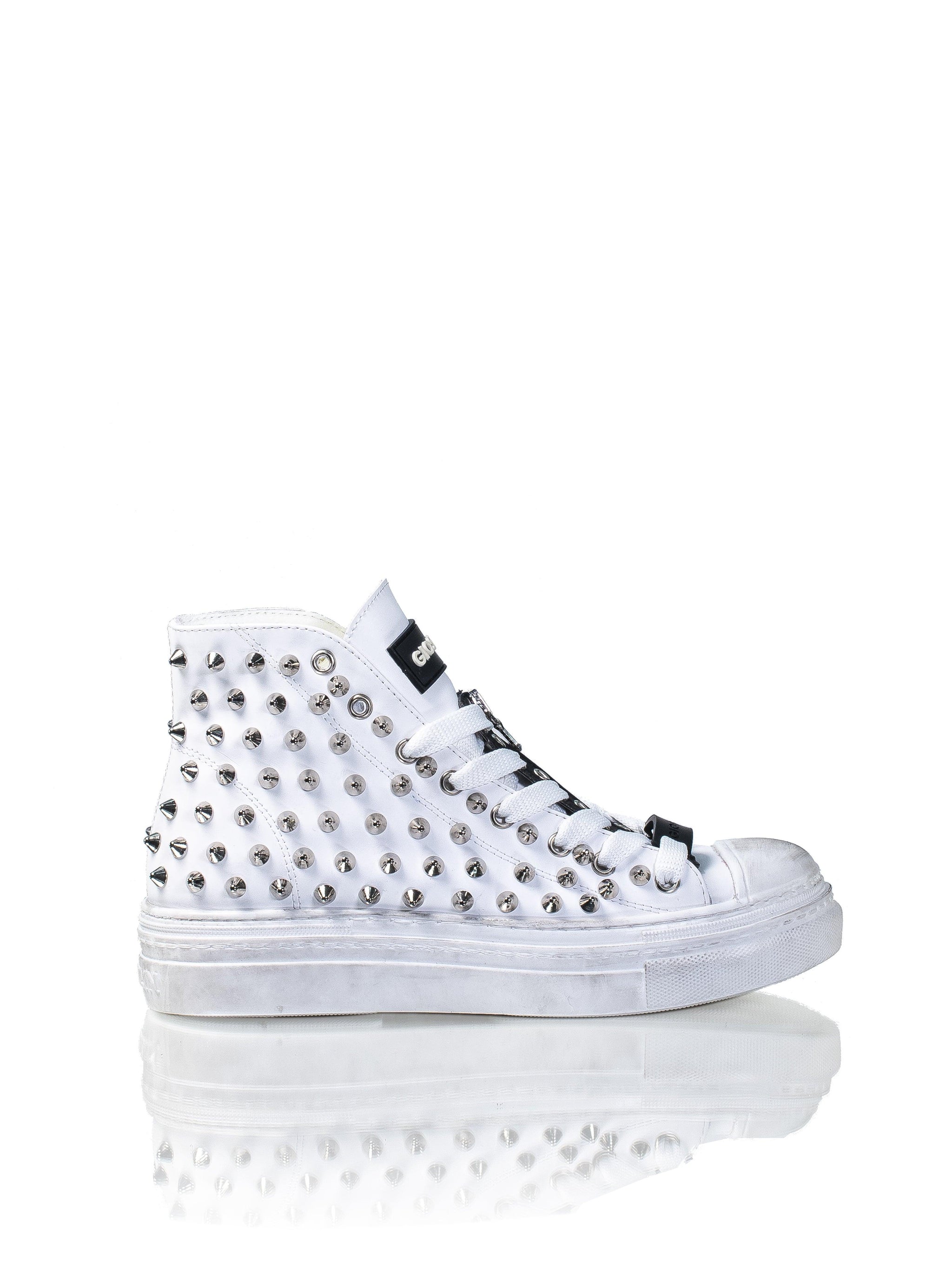 Queste sneakers non sono solo un semplice paio di scarpe; sono un'opera d'arte. Con il loro profilo alto e le borchie in nikel color argento, catturerai l'attenzione di tutti con ogni passo che fai. La linguetta ti permette di indossarle con facilità, mentre il modello stringato assicura una calzata sicura. La suola spessa e sagomata offre un comfort eccezionale e aggiunge un tocco in più alla tua altezza grazie ai suoi 5 cm.