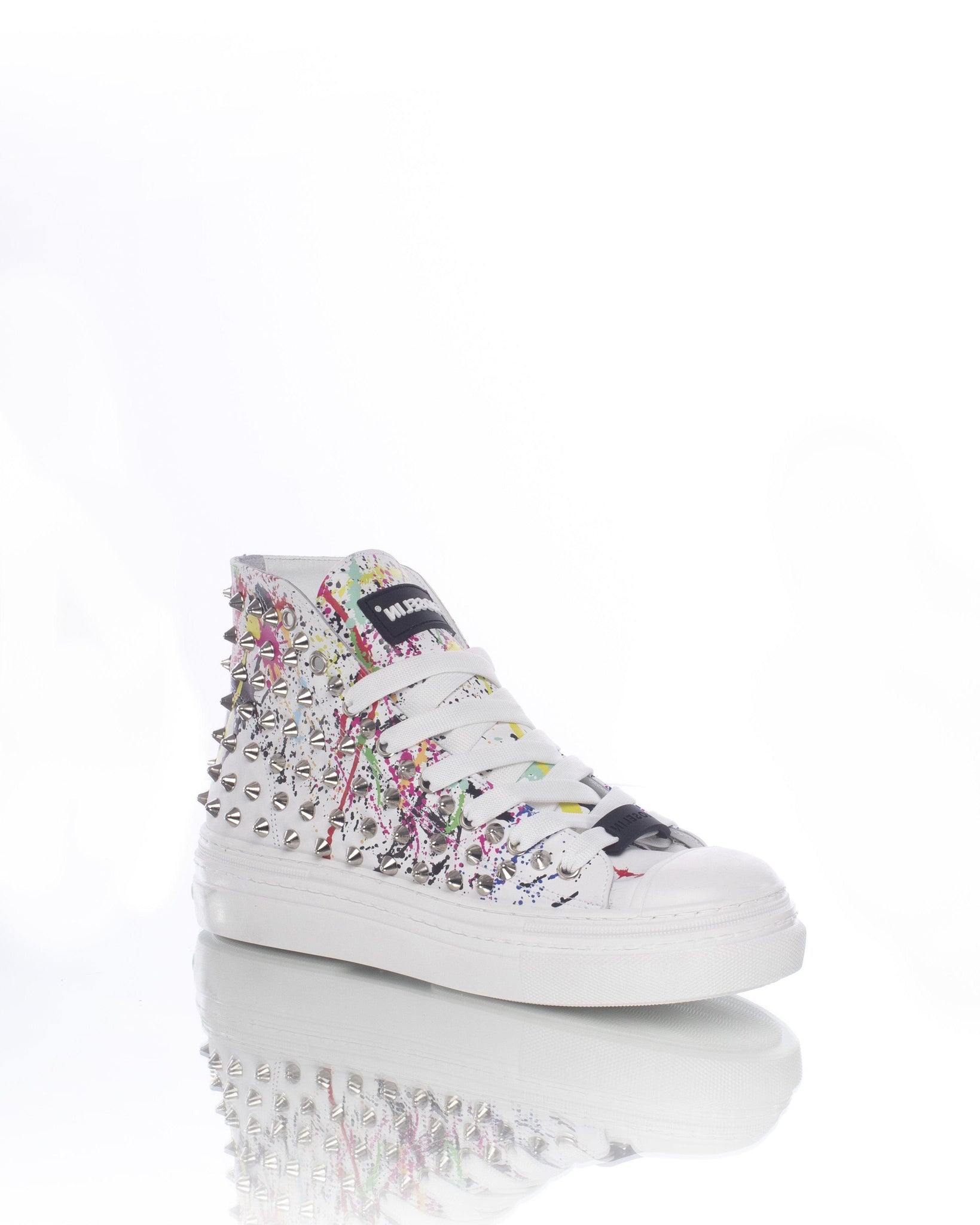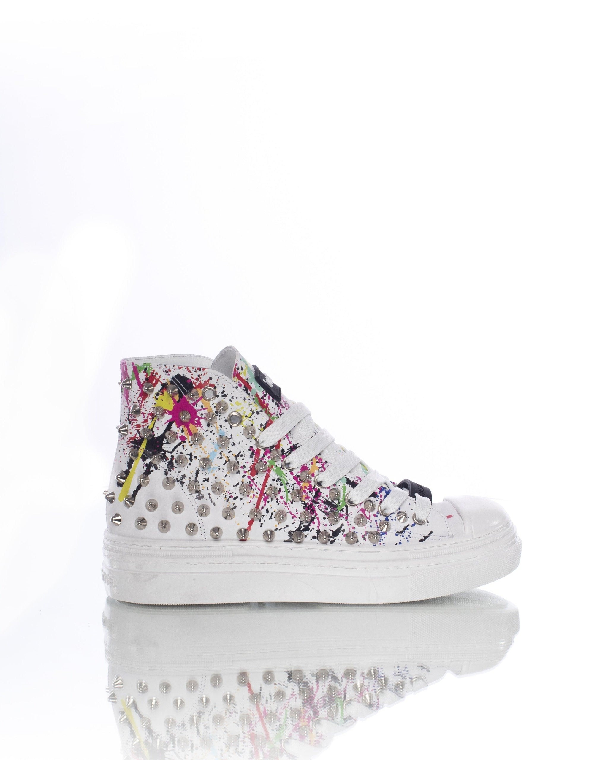 Queste sneakers non sono solo un semplice paio di scarpe; sono un'opera d'arte. Con il loro profilo alto e le borchie in nikel color argento, catturerai l'attenzione di tutti con ogni passo che fai. La linguetta ti permette di indossarle con facilità, mentre il modello stringato assicura una calzata sicura. La suola spessa e sagomata offre un comfort eccezionale e aggiunge un tocco in più alla tua altezza grazie ai suoi 5 cm.