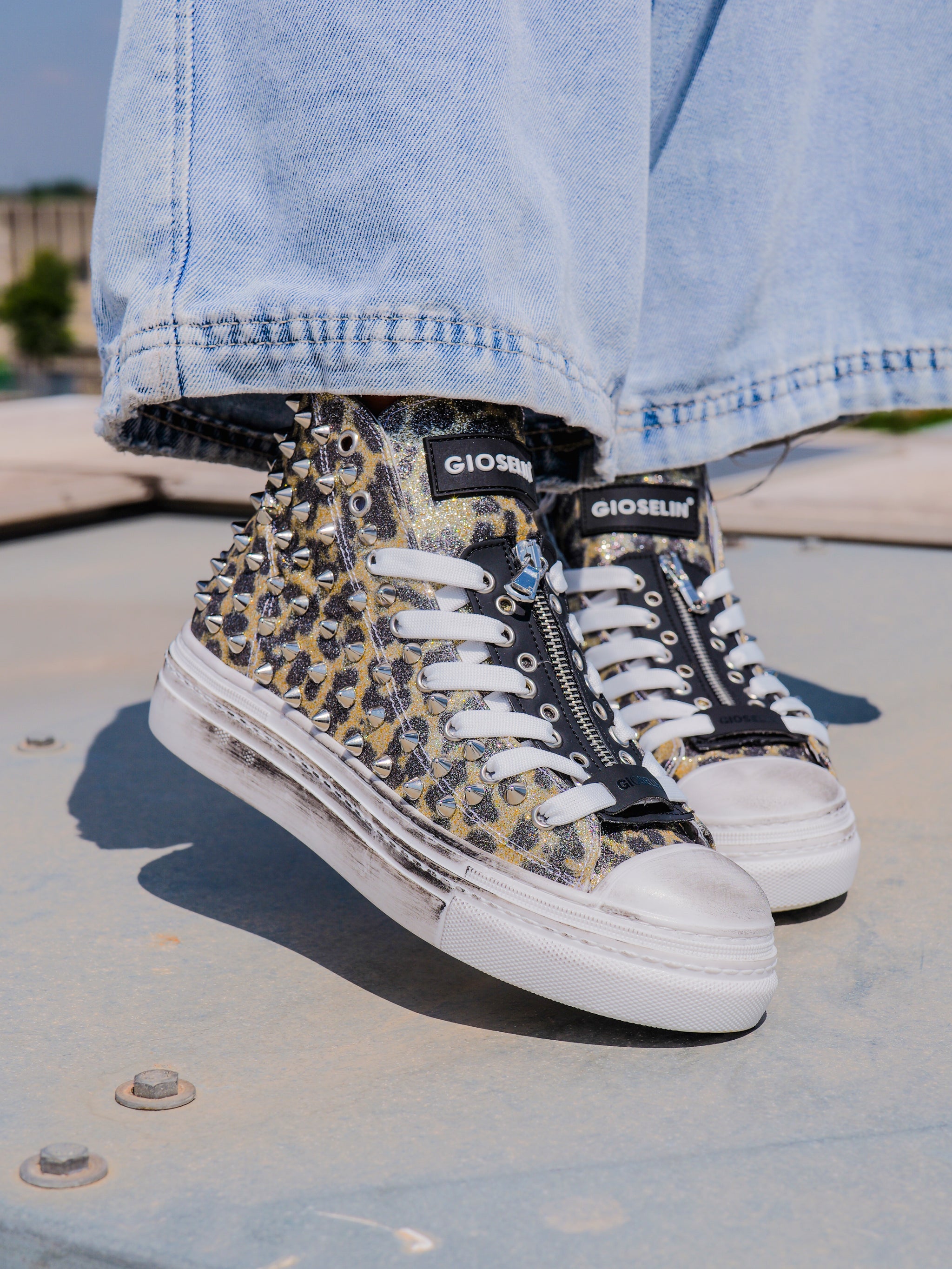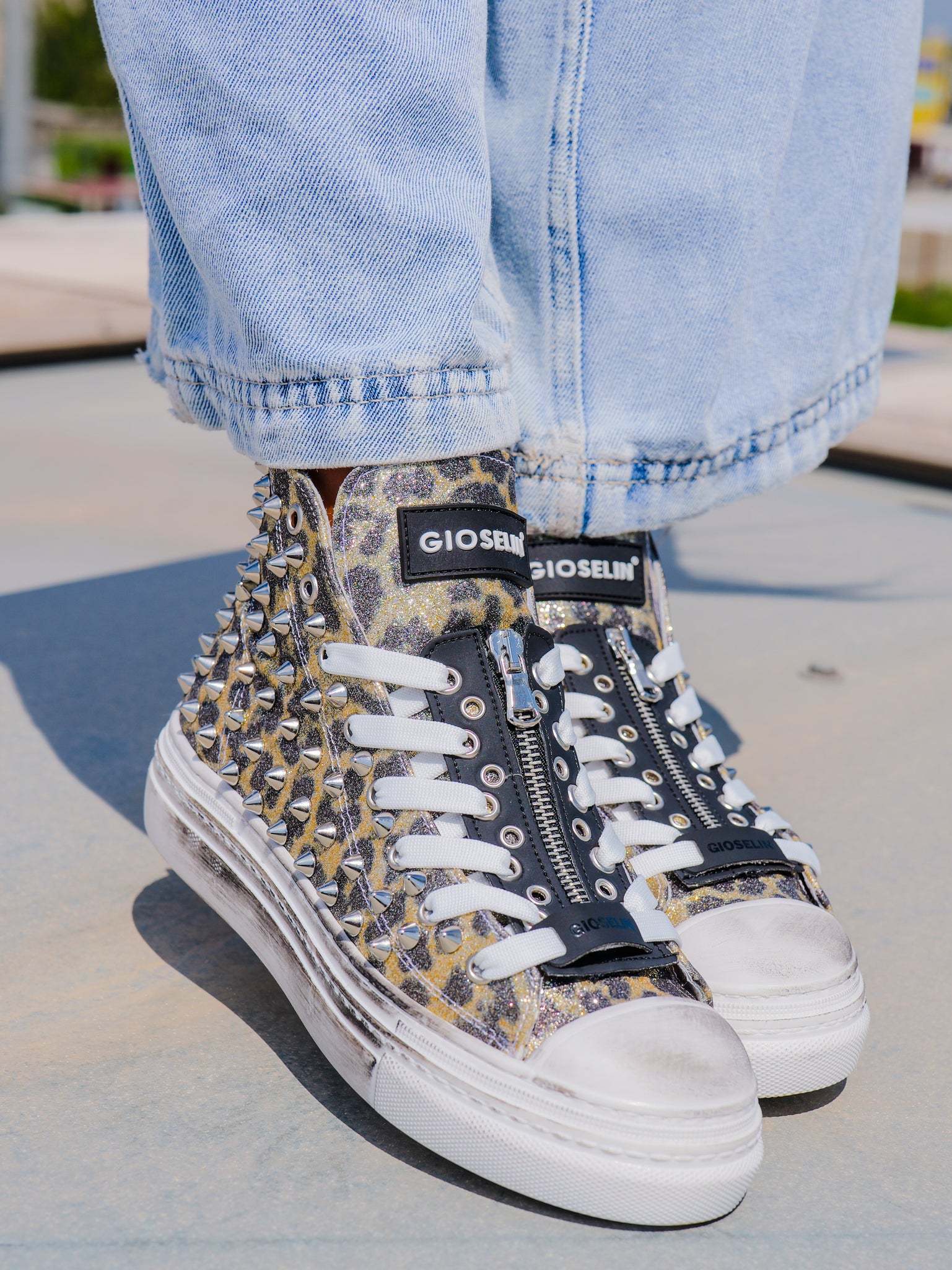 Grinta, luce e carattere senza compromessi. La nuova Play Glitter Wild è l’evoluzione del best seller Gioselin, reinterpretata per la collezione 2026 con un design che cattura lo sguardo al primo colpo. L’anima glam-rock incontra la forza dello stile urban grazie alla tomaia glitterata animalier, esaltata da borchie in metallo color argento e zip centrale funzionale.