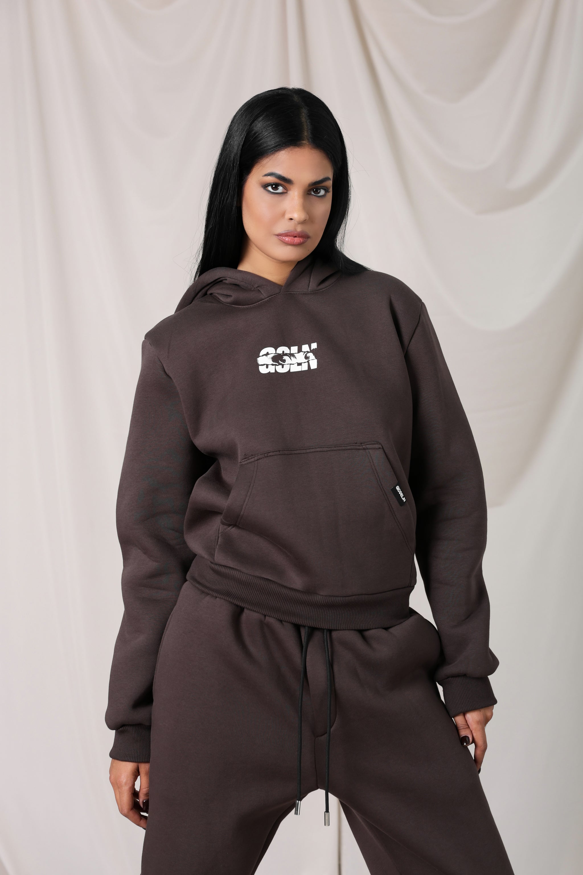 Un completo che esprime l’anima streetwear di Gioselin, mantenendo un tocco raffinato grazie alla nuance marrone. La modella indossa la taglia S.