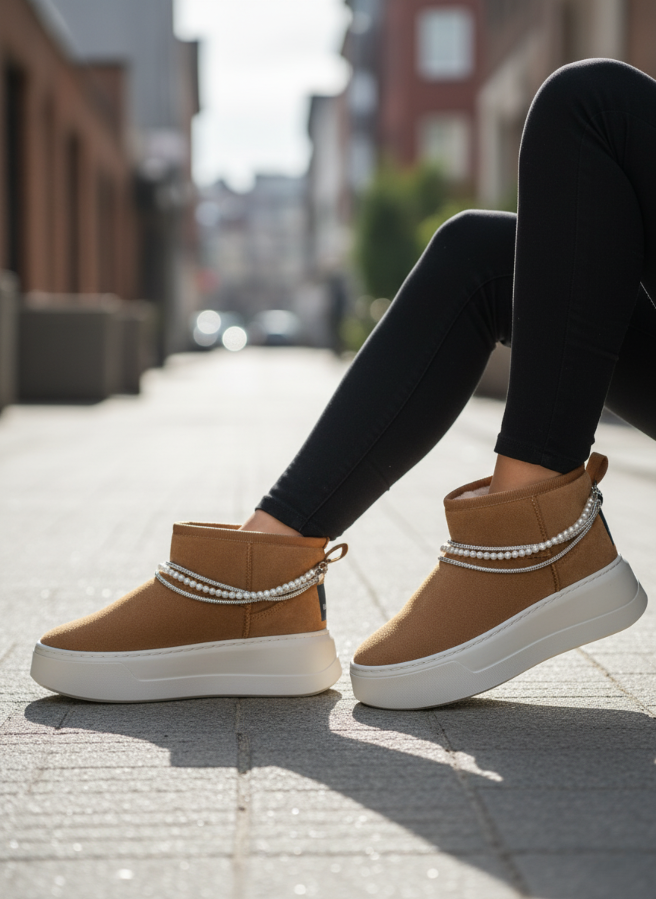 Viene illuminato da un dettaglio esclusivo: una doppia catena di perle e micro strass che avvolge con eleganza la tomaia, creando un contrasto perfetto con il tono caldo e naturale del camel. Un tocco luminoso che rende questo modello unico e irresistibile.