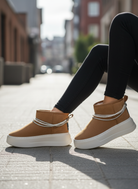 La suola platform bianca dona altezza e comodità, mantenendo leggerezza e stabilità, mentre la struttura avvolgente assicura un comfort termico ideale per tutta la stagione invernale.