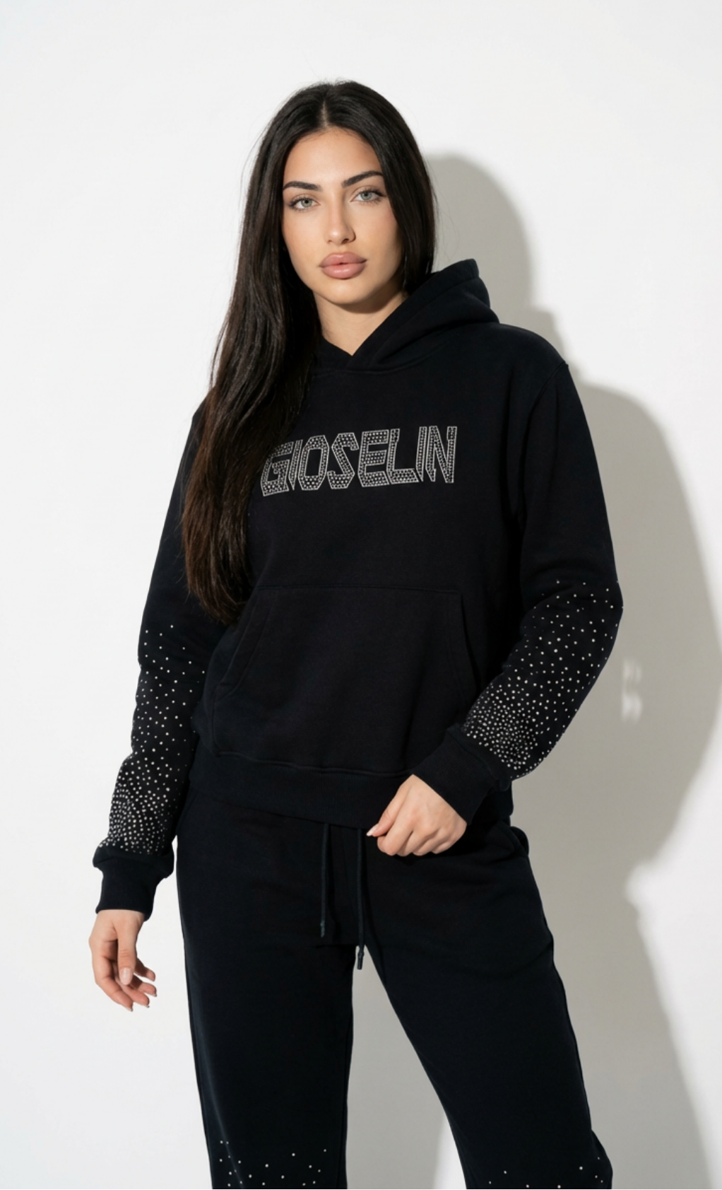 La felpa con cappuccio, dal taglio pulito e moderno, è impreziosita dal logo GIOSELIN in versione diamond, che dona carattere e identità al capo. Le maniche decorate con micro applicazioni brillanti creano un raffinato effetto degradé, trasformando un capo basic in una vera dichiarazione di stile.
