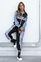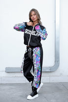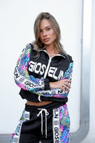 Il completo – venduto insieme – è composto da giacca zip cropped e pantaloni regolabili con coulisse, entrambi impreziositi dal logo Gioselin a banda laterale, vero tratto distintivo del brand. Ma ciò che rende unica Jungle è il suo design: pattern jungle multicolor che abbracciano maniche e fasce laterali, con accenti fluo e animalier che catturano lo sguardo e riflettono tutta la potenza della tua energia interiore.