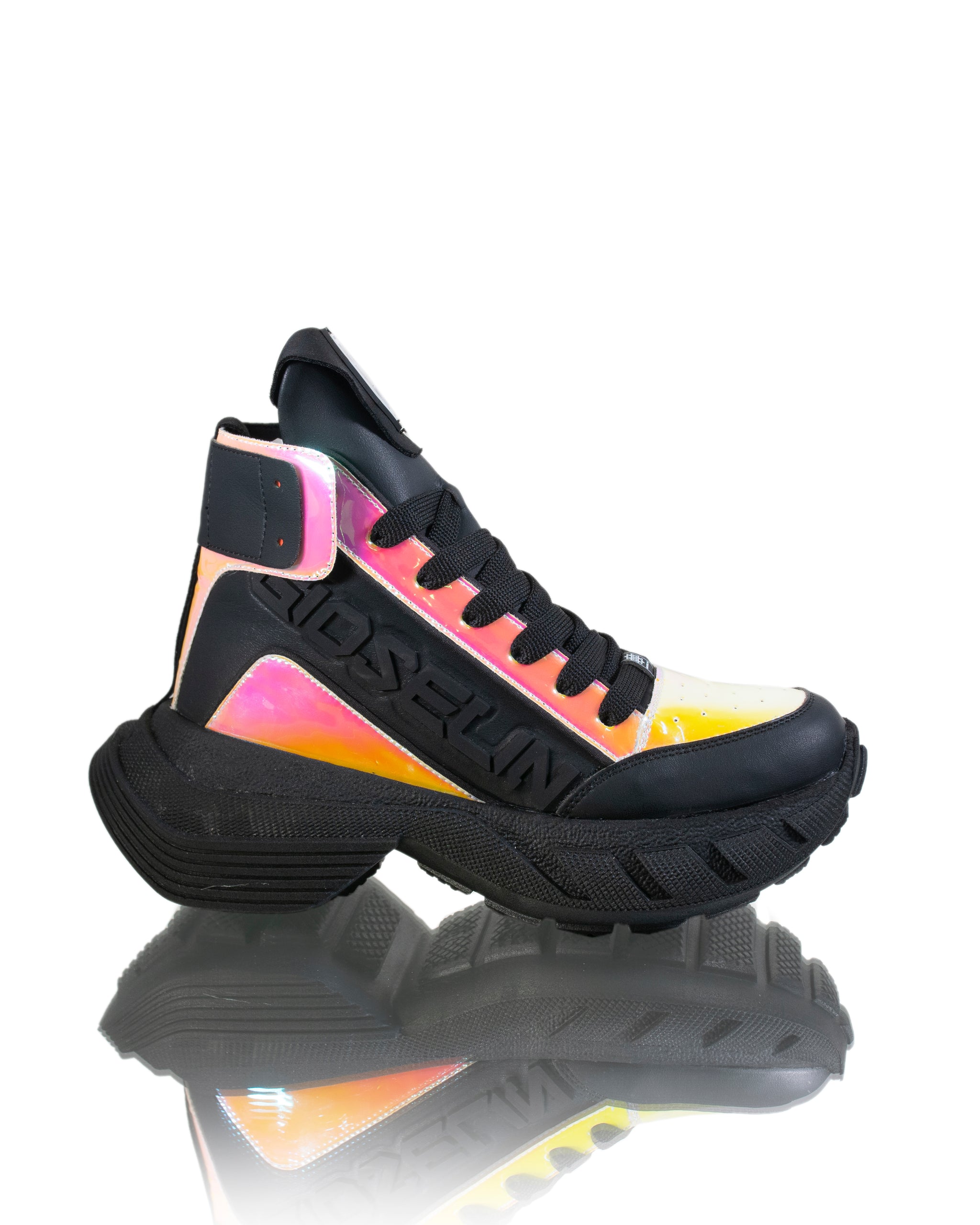 Per la cura di queste sneakers, ti consigliamo di pulirle con un panno o una spugna umida per mantenere la loro luminosità nel tempo. La tomaia è realizzata in ecopelle liscia, conferendo alle sneakers un aspetto pulito e moderno. L'interno delle scarpe è realizzato al 100% in tessuto per offrire comfort durante l'uso. La suola è composta al 100% in gomma, garantendo una calzatura durevole e di qualità. Con le sneakers con dettagli iridescenti Gioselin, puoi camminare con stile e attirare l'attenzione ovunque tu vada.omma.