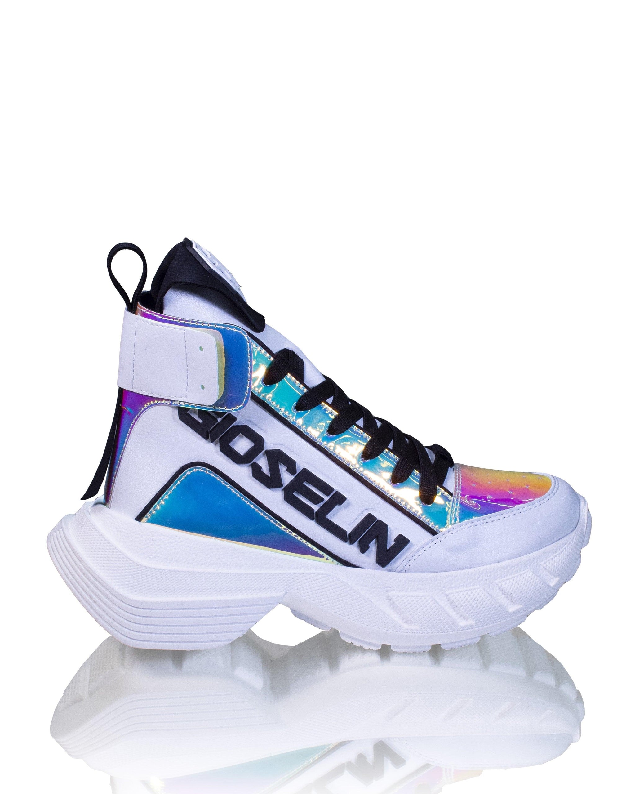Per quanto riguarda la cura di queste sneakers, ti consigliamo di pulirle con un panno o una spugna umida per mantenere il loro aspetto luminoso nel tempo. La tomaia è realizzata in ecopelle liscia, conferendo alle sneakers un aspetto pulito e moderno. Con le sneakers con dettagli iridescenti Gioselin, puoi camminare con stile e attirare l'attenzione ovunque tu vada.Interno: 100% tessuto. Suola: 100% gomma.