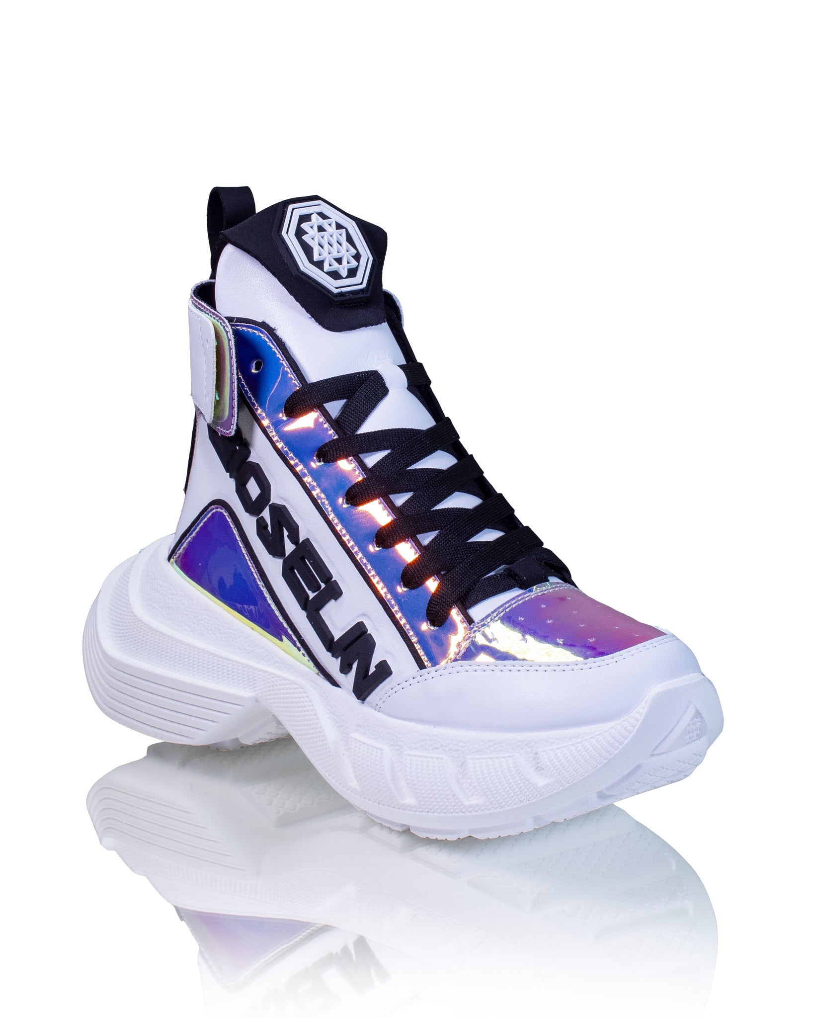 Le sneakers bianche con inserti iridescenti sono il connubio perfetto tra stile e comfort. Questo modello presenta un profilo alto che aggiunge un tocco di audacia al tuo look, mentre i lacci garantiscono una calzata sicura e personalizzata.