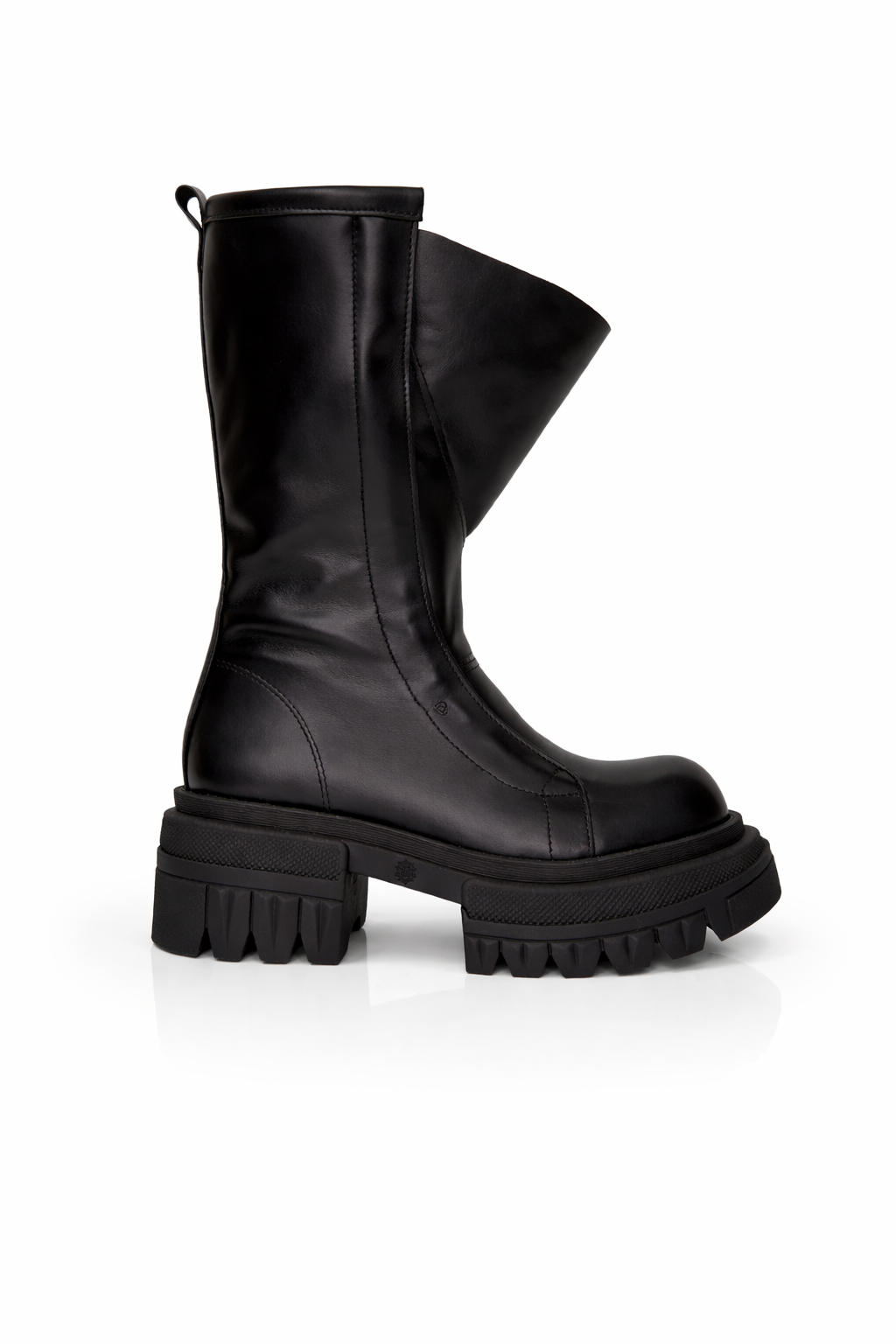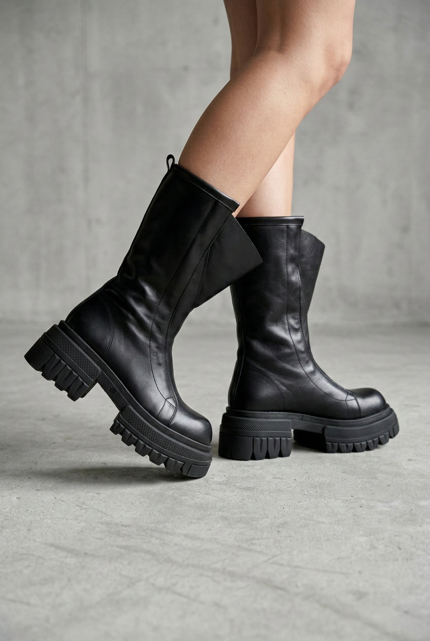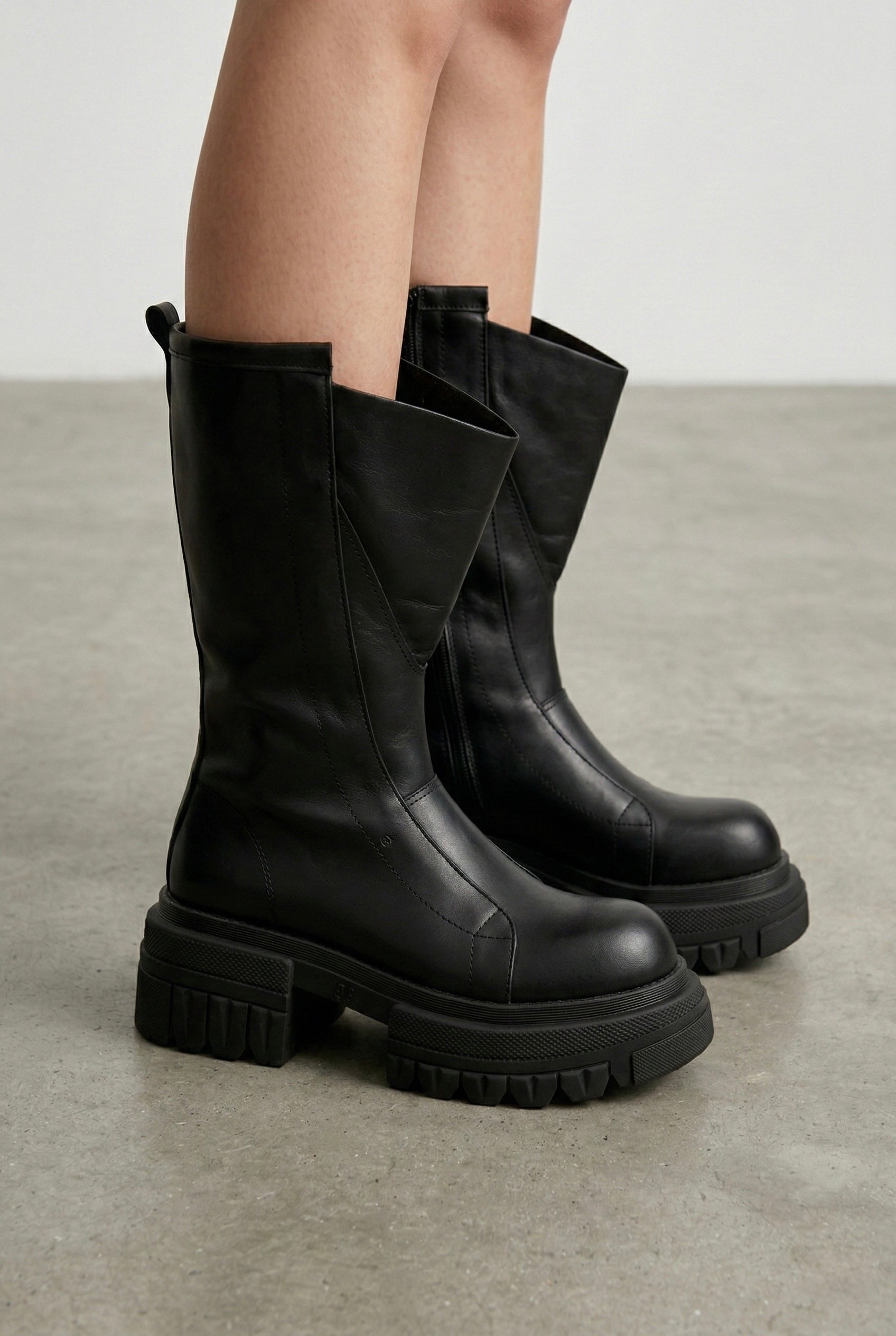 La linea essenziale e pulita esalta la nobiltà della pelle, mentre la suola carrarmato platform introduce un contrasto moderno che conferisce presenza scenica e stabilità. La costruzione mid-calf avvolge la gamba offrendo comfort e supporto, rendendo lo stivale ideale per look dal gusto urban-luxury e combinazioni più ricercate.