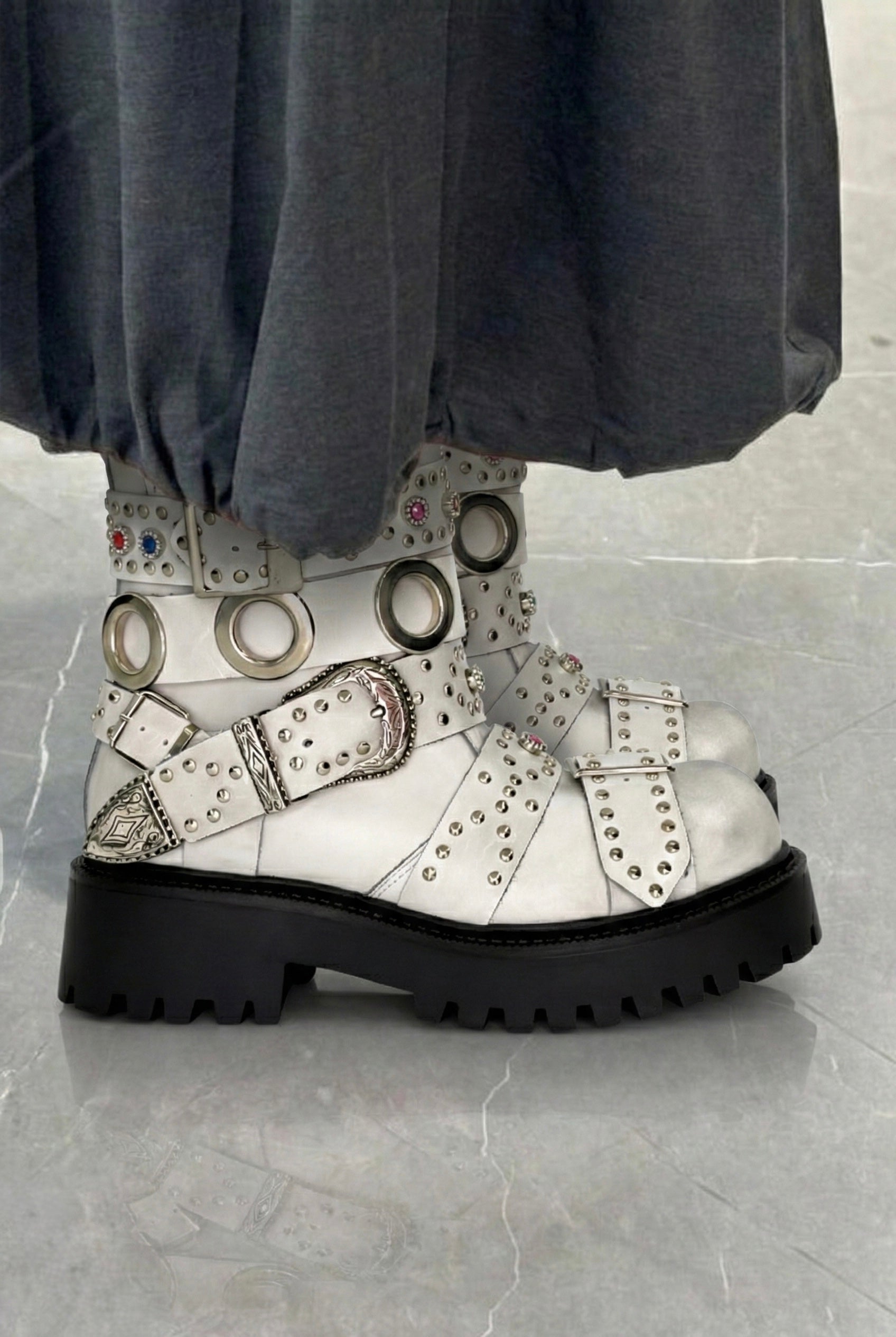 • Cinturini multipli decorati da micro-borchie argentate e maxi-occhielli metallici che catturano la luce e aggiungono un tocco rock-lux irresistibile