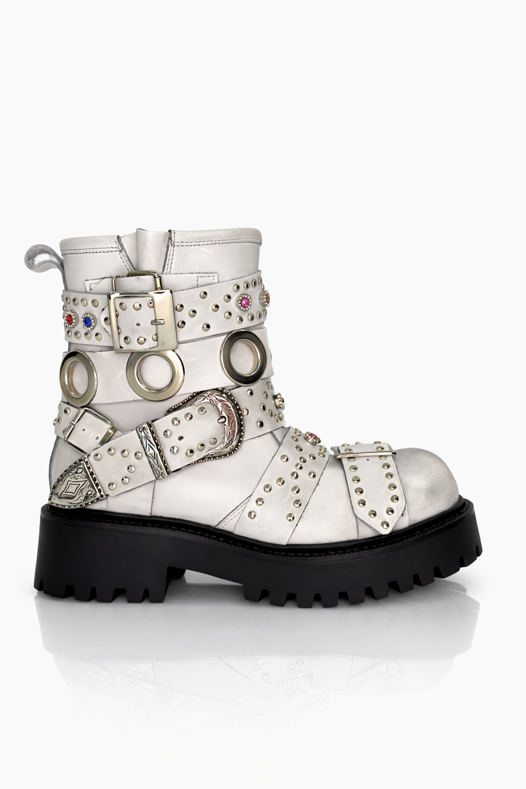 • Applicazioni con pietre colorate che illuminano l’anfibio e creano un gioco di contrasti tra black leather e sparkle multicolor