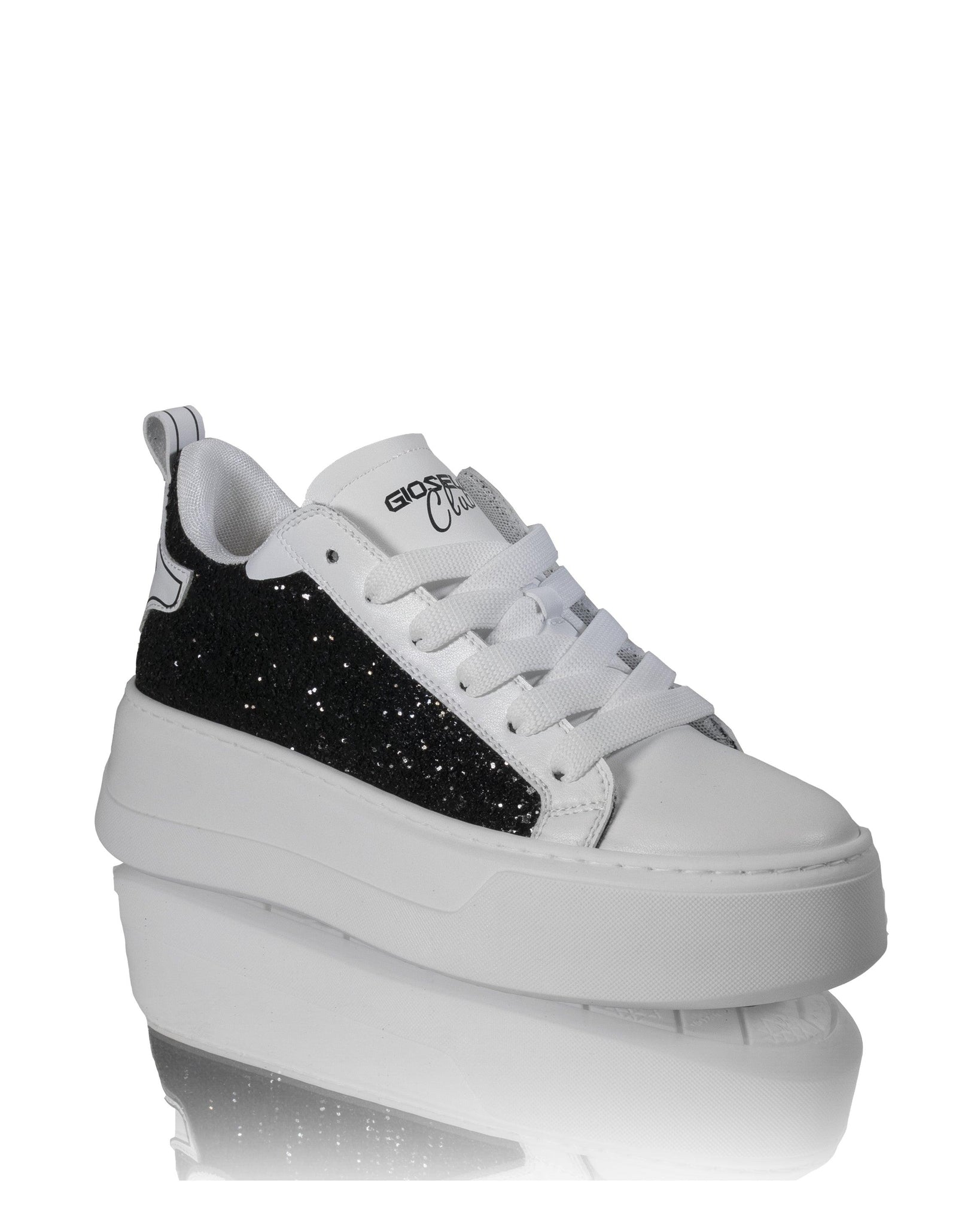 In sintesi, queste sneakers bianche con dettagli in nero glitter sono la scelta ideale per chi desidera un tocco di eleganza e glamour nel proprio guardaroba. Indossale e preparati a fare una dichiarazione di moda che non passa inosservata.omma.