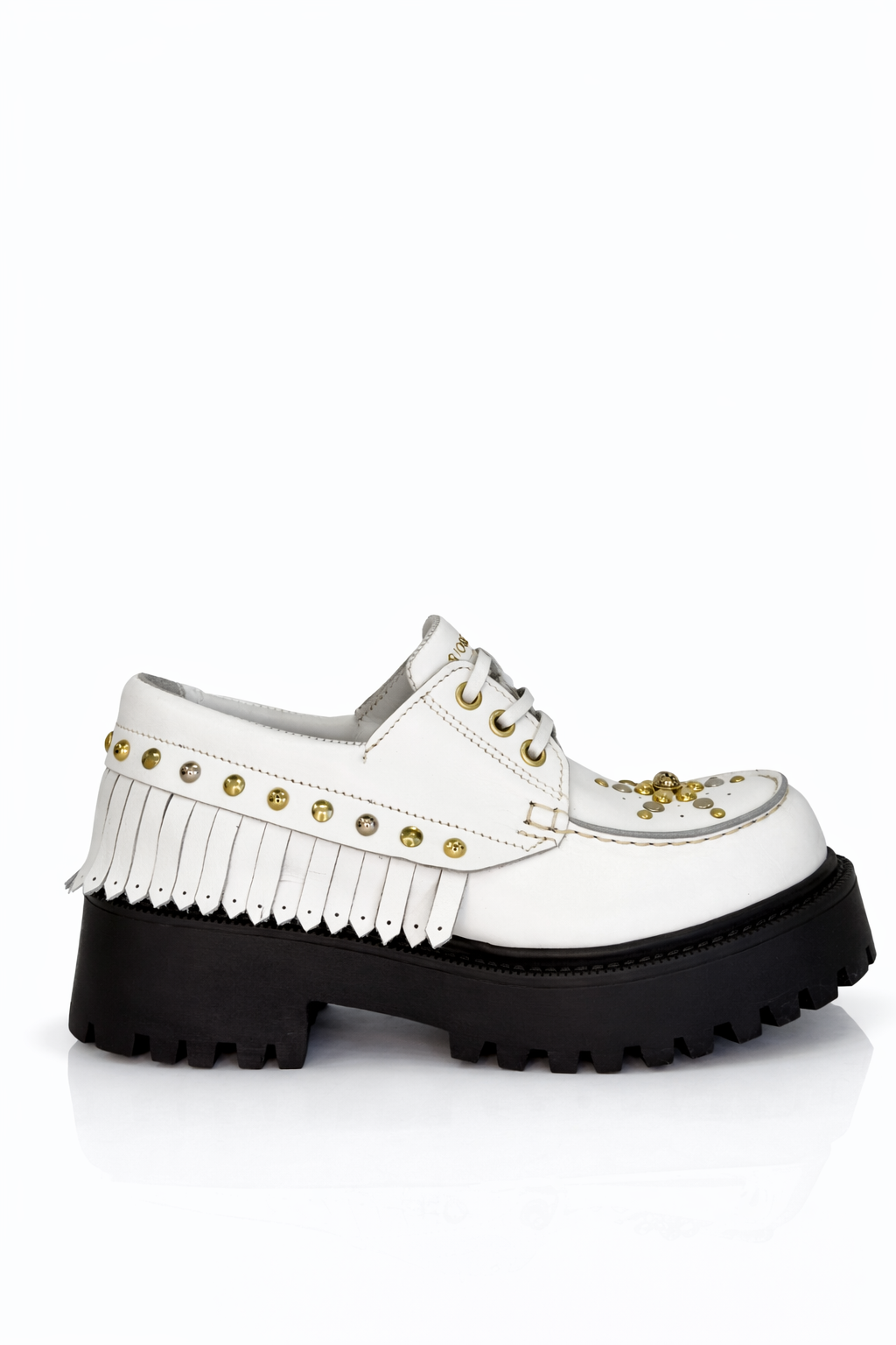 Mocassino platform dallo stile ricercato e contemporaneo, realizzato interamente in vera pelle e caratterizzato da dettagli decorativi che esaltano la personalità del modello. Le applicazioni metalliche e la lavorazione con frange laterali donano movimento e unicità alla silhouette, creando un perfetto equilibrio tra eleganza e spirito urban.