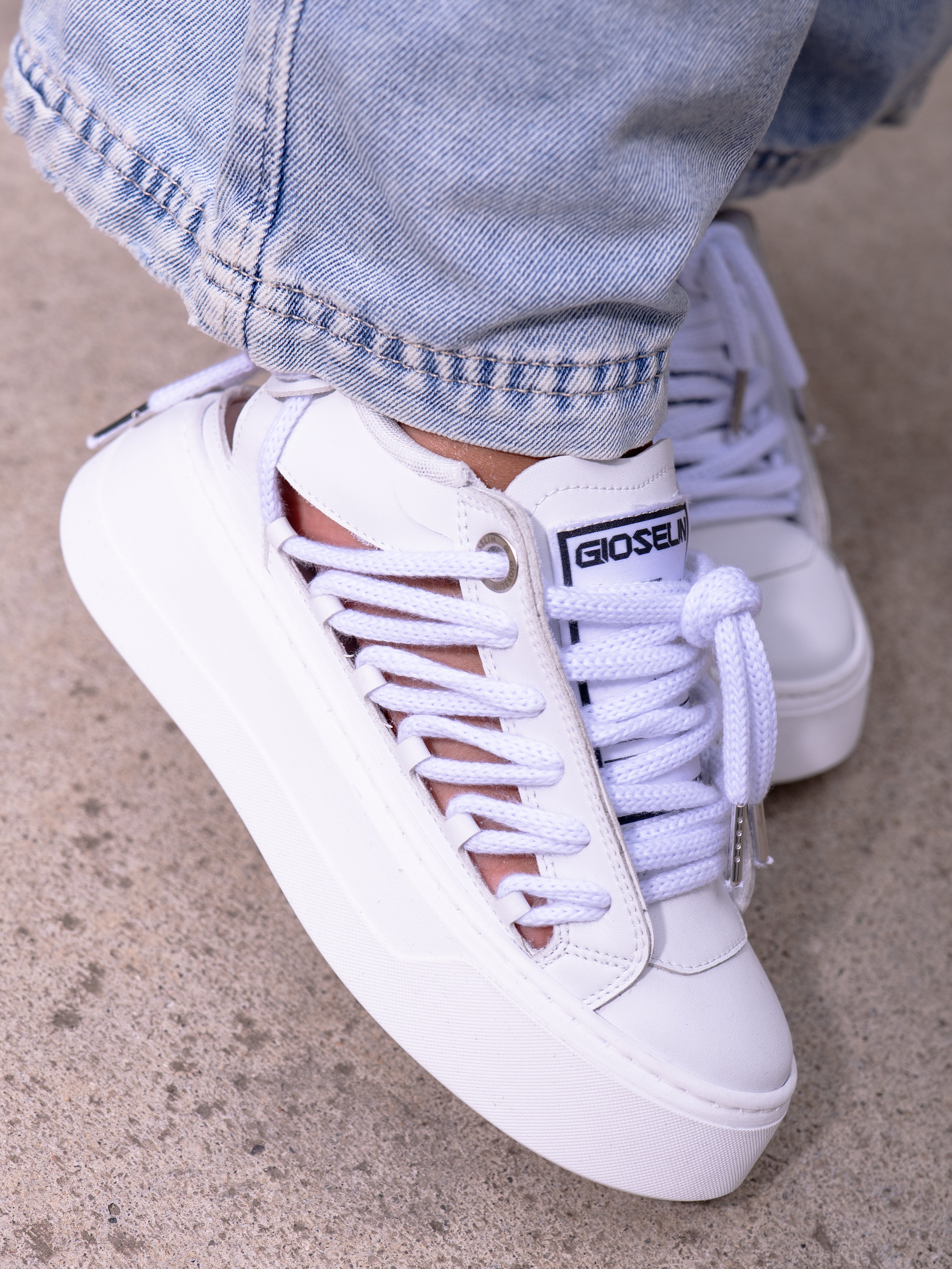 La tomaia semiaperta dona leggerezza visiva, mentre i lacci oversize bianchi completano il look in modo elegante e monocromatico. Un mix di semplicità e carattere che si adatta a ogni occasione.
