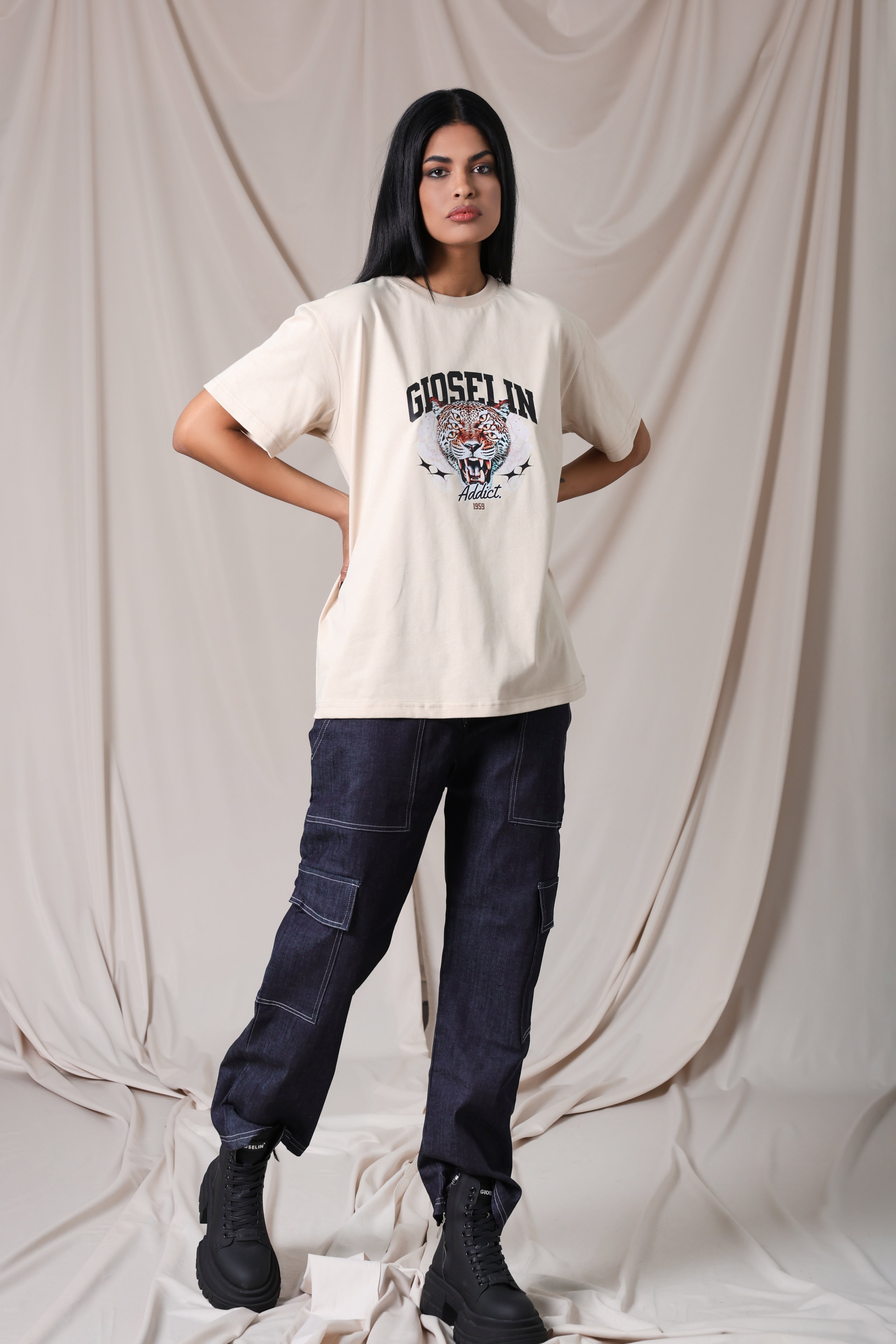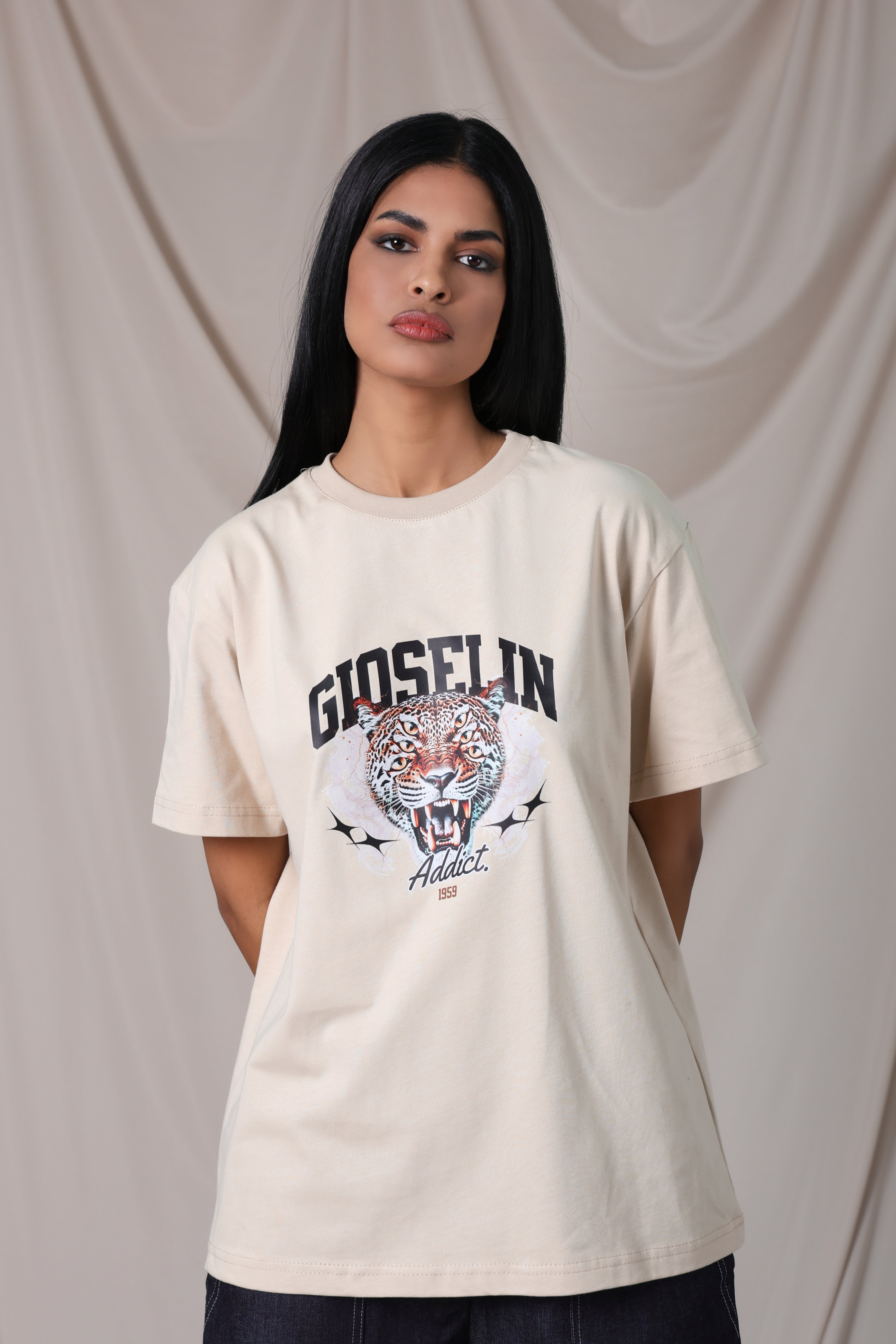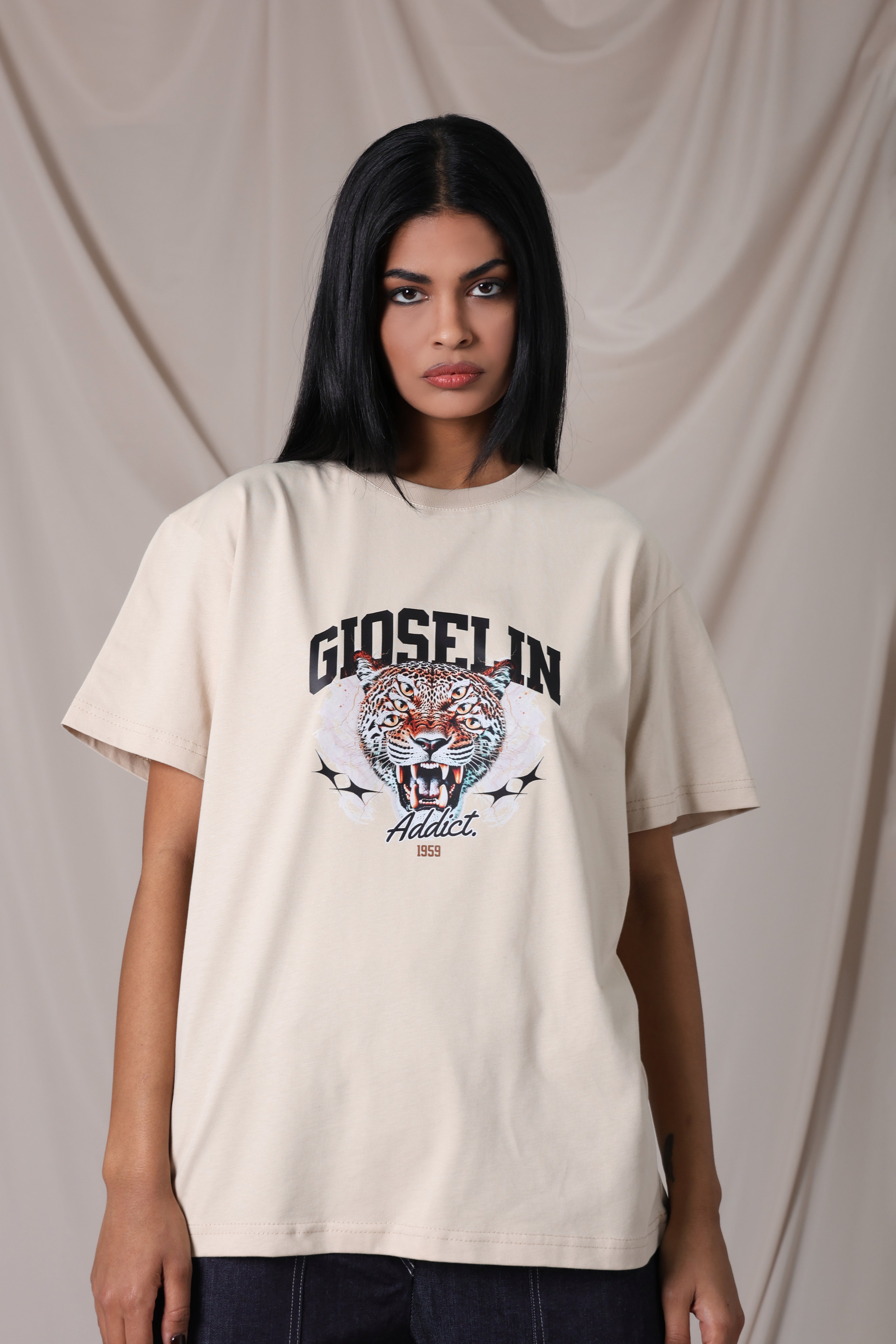La T-Shirt Tiger Beige è un capo iconico della nuova collezione Gioselin, realizzata in 100% cotone per garantire freschezza, comfort e traspirabilità.