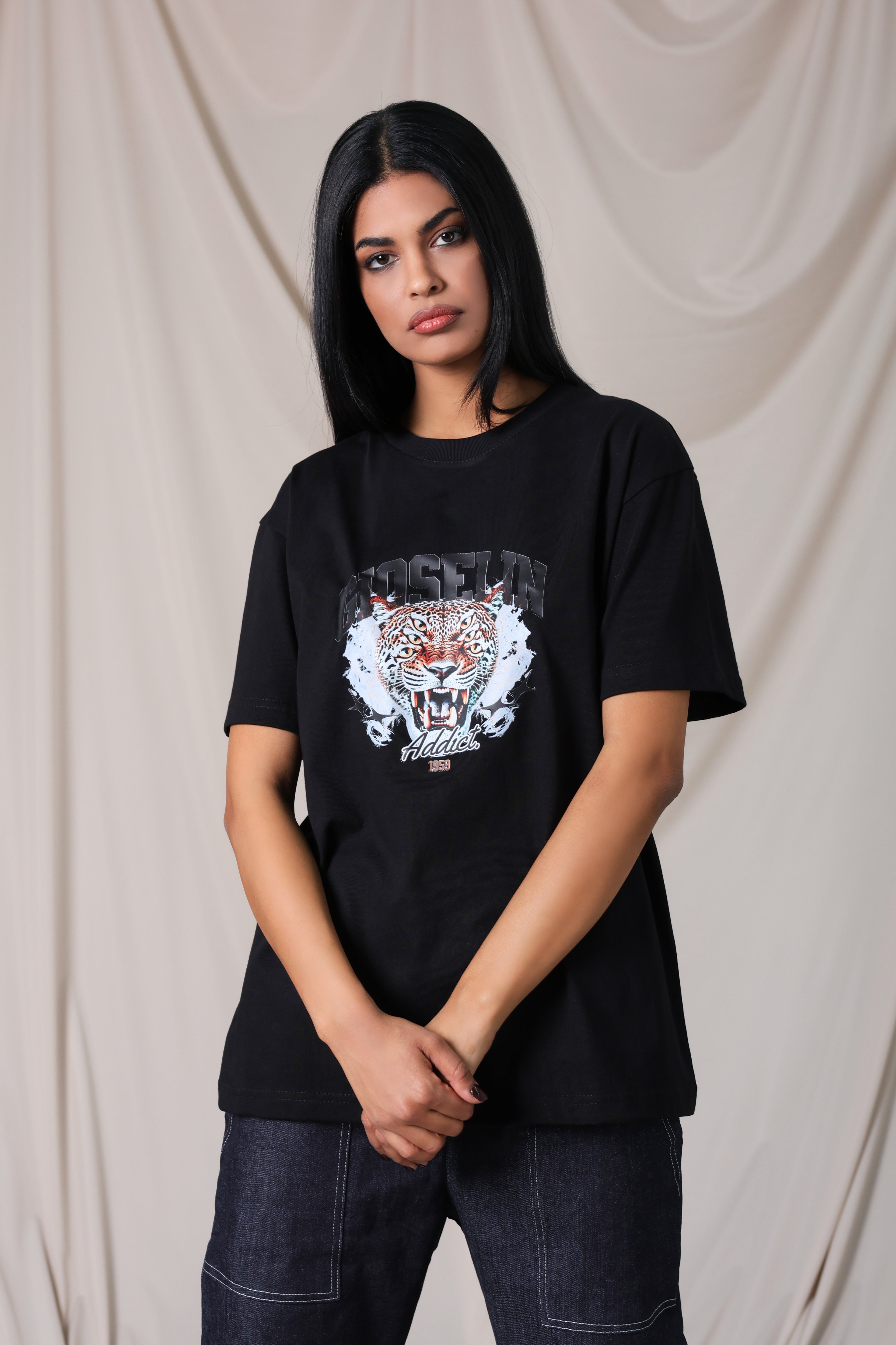 La T-Shirt Tiger Nera è un capo iconico della nuova collezione Gioselin, realizzata in 100% cotone per garantire comfort e resistenza.