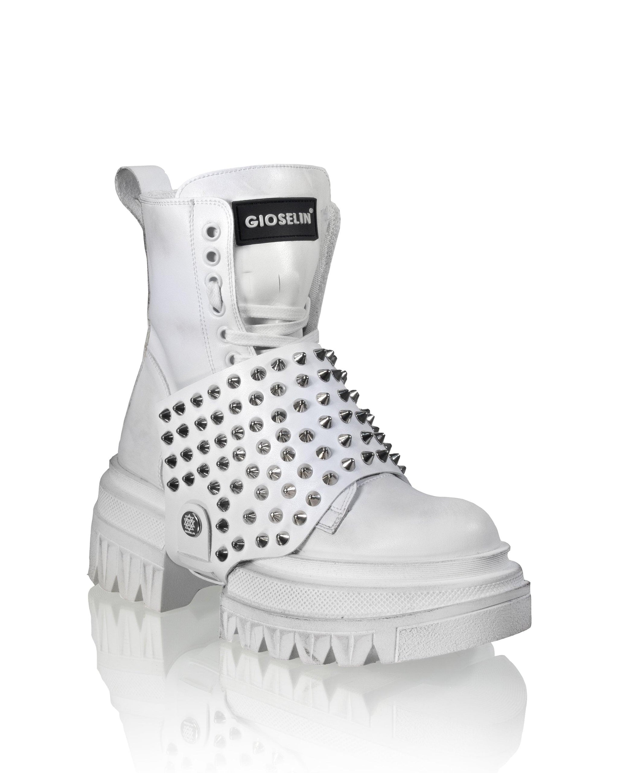 Gli Anfibi Bianchi con Borchie sono ideali per completare un look audace e unico. Sia che tu li indossi per un'uscita speciale o per esprimere il tuo stile personale, questi anfibi sono la scelta ideale per chi cerca un tocco di grinta e ribellione nella moda, con un tocco di personalità.