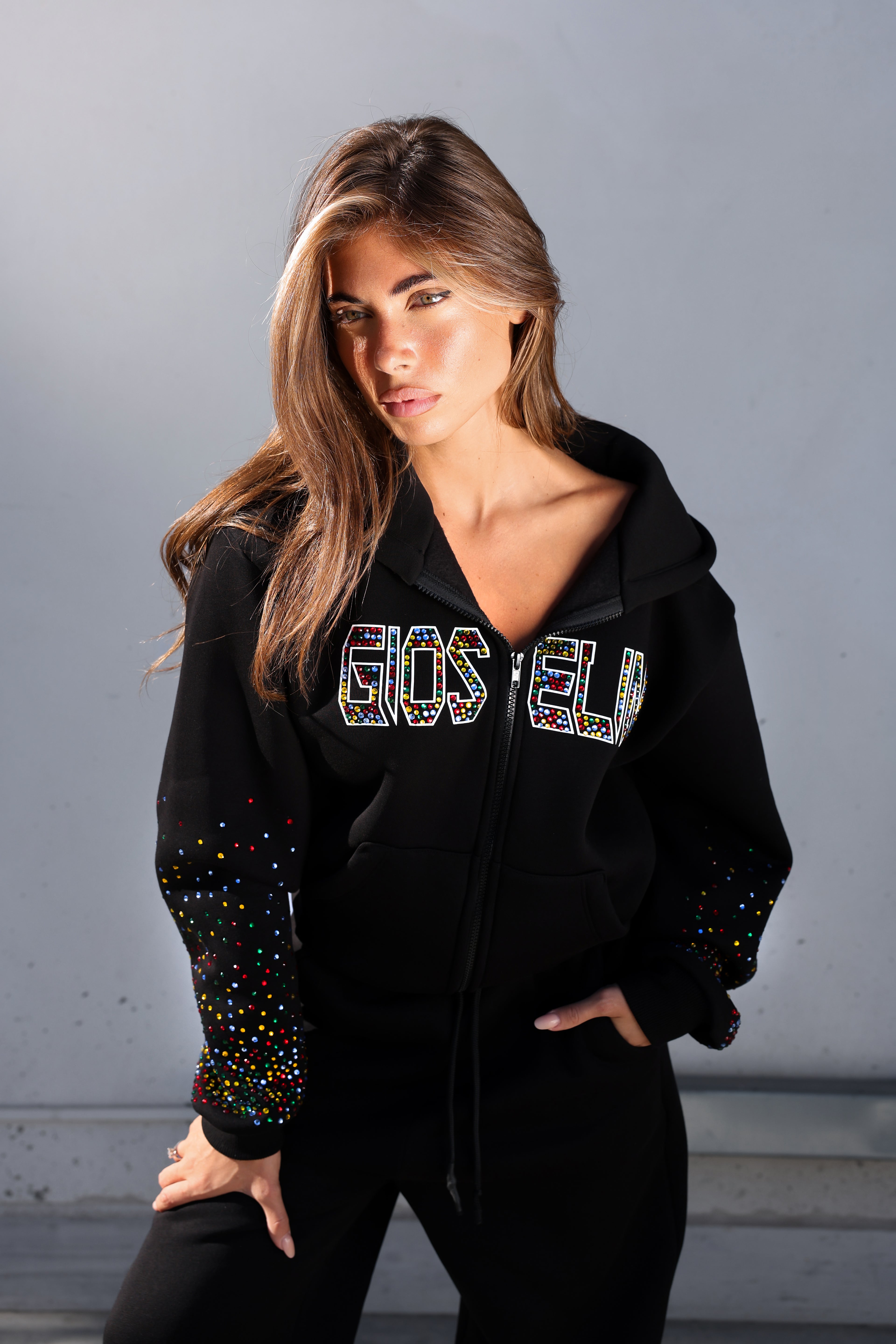Il suo punto di forza è la scritta GIOSELIN effetto diamond multicolor, un’esplosione di luce e cromie che illumina la felpa e rende unico ogni look.