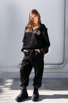 A completare il design, una pioggia di brillantini multicolor che impreziosisce maniche e fondo del pantalone, creando un effetto scenico ricercato, moderno e vivace.