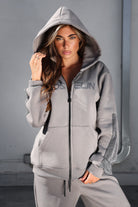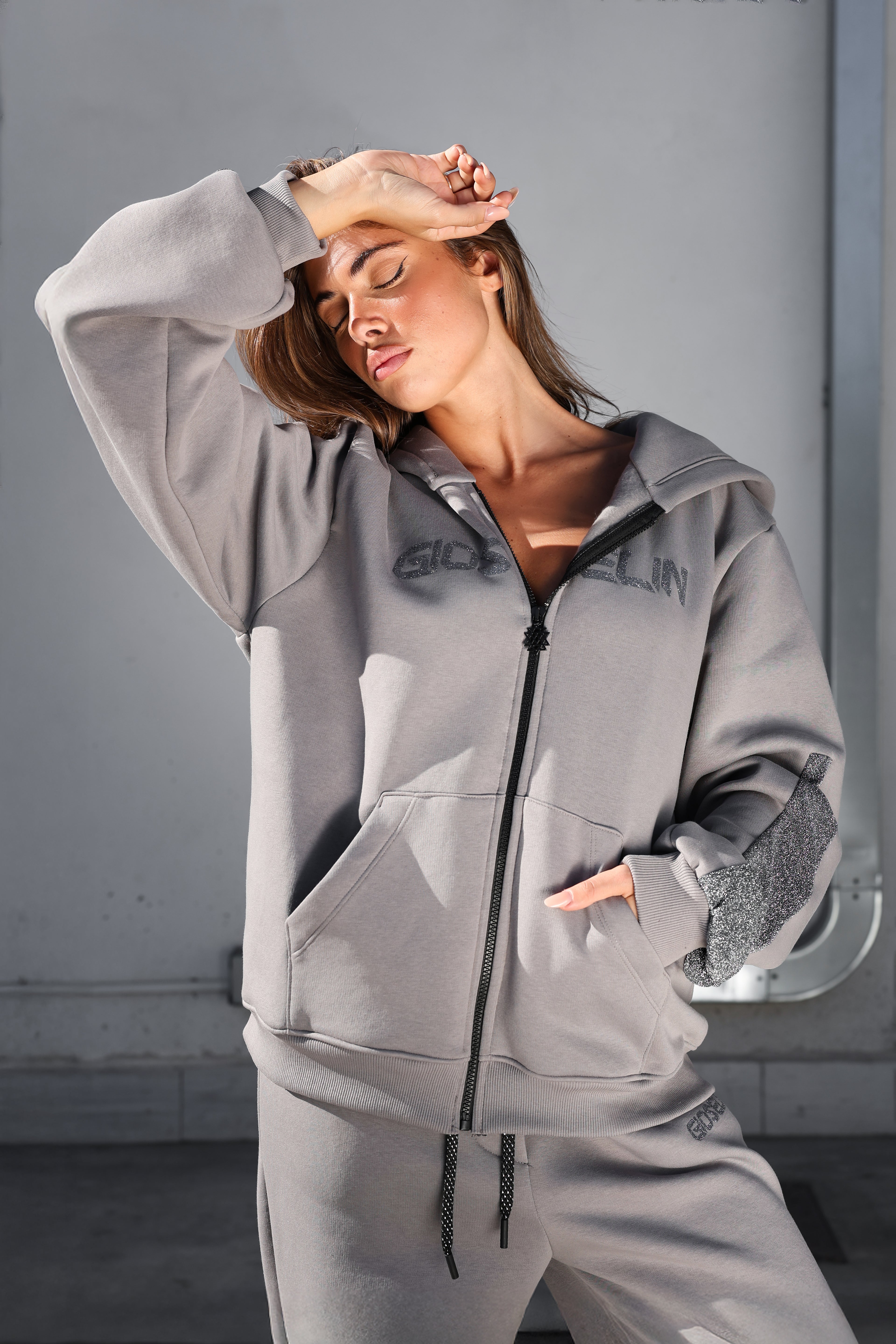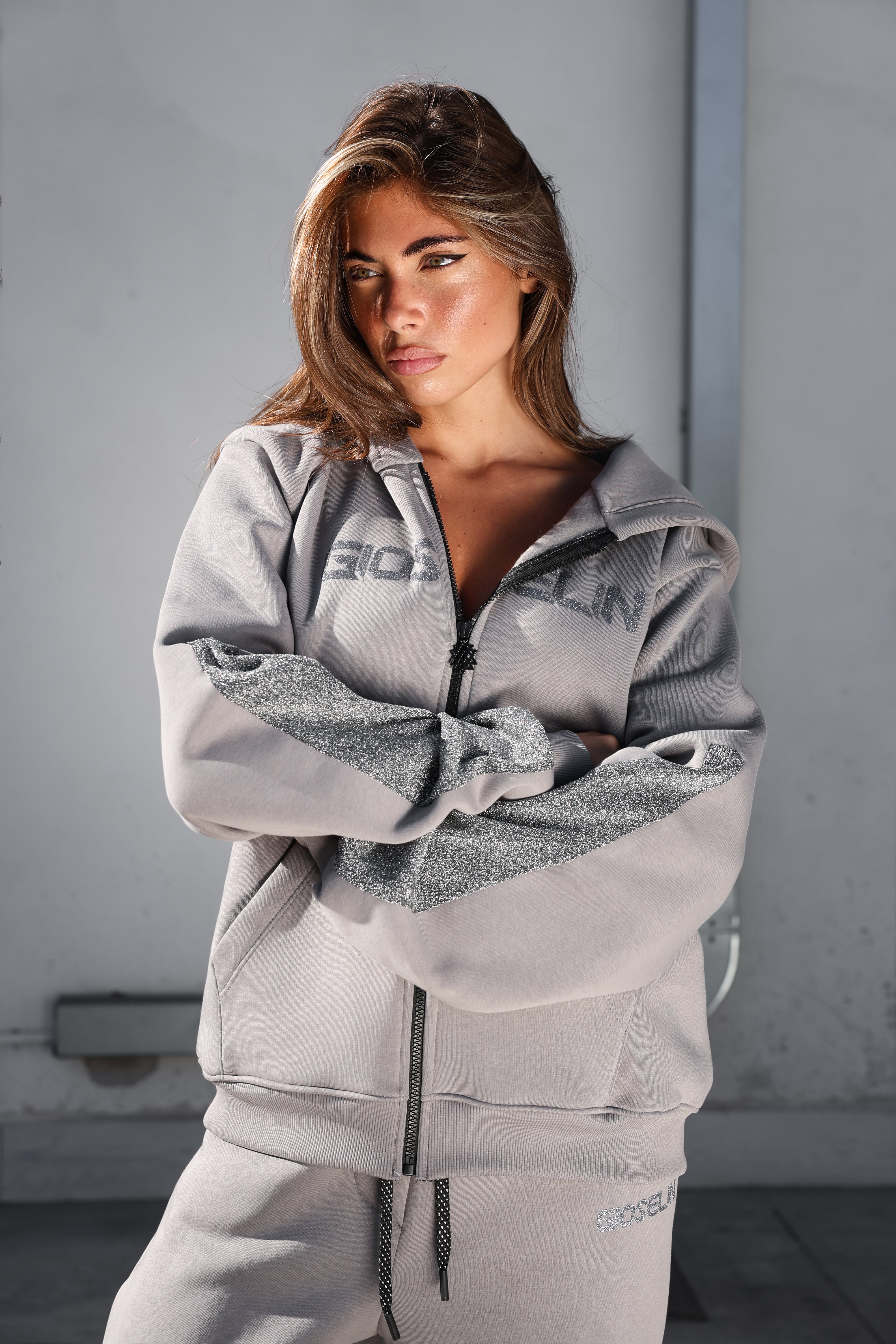 Realizzata con interno felpato caldo, avvolge il corpo in una sensazione di morbidezza ideale per la stagione invernale. La felpa porta cappuccio, tasche frontali ed elastico in vita, garantendo una vestibilità comoda e moderna. Le maniche arricchite da inserti in lurex argento donano un tocco brillante e distintivo, mentre la scritta Gioselin in lurex sul petto completa il design con un effetto luminoso e ricercato.