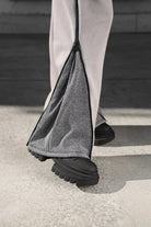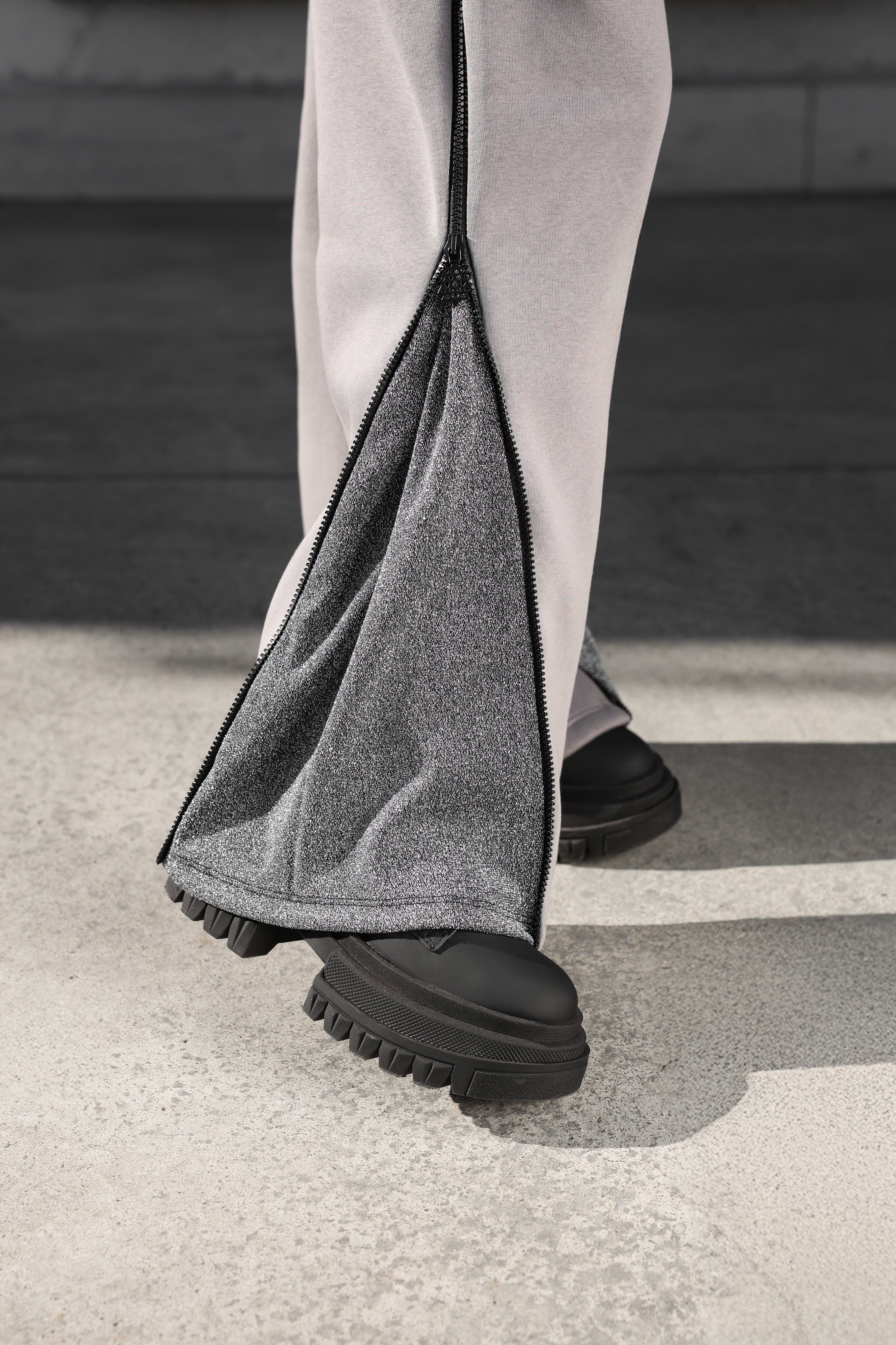 Il pantalone, ampio e confortevole, presenta molla in vita con coulisse regolabile, studiata per adattarsi perfettamente alla silhouette. L’elemento iconico è la zip laterale, che una volta aperta rivela un ampio pannello interno in lurex silver, creando un contrasto moderno e scenografico.